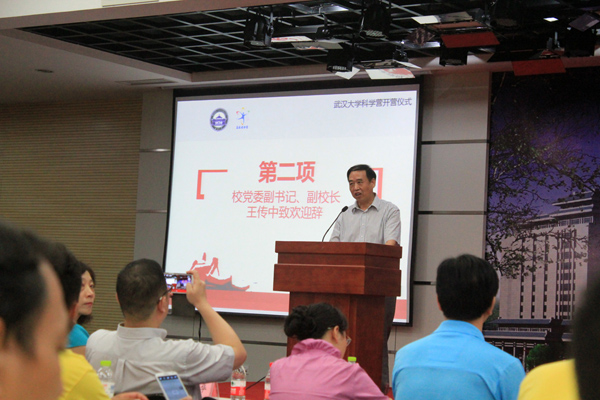 上午,所有营员在武大新图馆报告厅参加了武汉大学科技营的开营仪式。在开 营仪式上,我们听到了来自武大和湖北省科协诸多领导和老师对我们科学营之旅的殷切期待和衷心祝福。武汉大学党委副书记、副校长王传中在致辞中欢迎带队老师和营员们的到来,阐释了科学营在培养青少年科学精神与科学素养方面的作用,并对营员们提出三点希望:一是希望同学们能够深入交流,增进友谊,充分展现当代青少年的青春风采;二是希望同学们能够勤于学习,知行合一,努力争做当代青少年的先锋榜样;三是希望同学们能够心存梦想,脚踏实地,早日成长为科技创新事业的明日栋梁。湖北省科协党组书记、副主席夏航也作了讲话,他希望本次活动能够在高校和高中之间架起桥梁,交流创新人才培养模式,为国家培养科技创新后备人才,培养中国特色社会主义建设者。开幕式结尾,武汉大学党委副书记、副校长王传中向营员代表授旗。