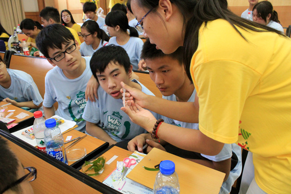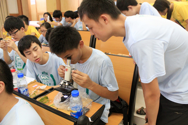 下午,科普教育组张凡作了“水生植物的适应性”的主题讲座,主要介绍水生物的相关知识。讲座结束后,植物园的工作人员带领营员们进行实地参观,向营员们介绍了植物器官为了适应水生环境而产生的变异。观赏结束后,营员们回到集中中心,开始制作切片并用显微镜观察的实验,营员对实验表现出了极大的兴趣,各小组通过反复试验最终成功制作出了能在显微镜下观察的切片。