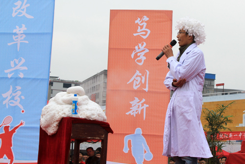 高一师生表演的舞蹈《小苹果》俏皮而可爱,高二师生表演的健美操《点亮未来》激情而动感,高三女教师表演的群舞《燃烧的岁月》热烈而柔美,后勤离退休女教师表演的广场舞《拉鲁湾情歌组舞》热情奔放,跳出了老教师们别样的风采;高一学生表演的拉丁舞,高二学生表演的歌舞,高三学生表演的校园歌曲连唱,异彩纷呈;科技表演秀《泡沫喷泉》让学生大开眼界;诗朗诵《一中,你好!》以诗歌的形式串起了阳新一中百年发展史,以礼赞的方式讴歌了阳新一中拼搏进取的奋斗历程。