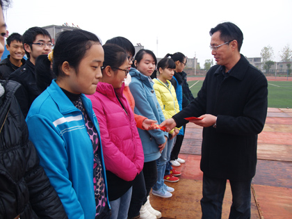阳新一中副校长、高三年级负责人梁师稳给获奖学生颁发奖金 |
