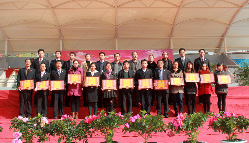 柯友国局长、尹闻杰副局长,明道树校长及阳新一中校领导,赞助单位代表为获奖学生团队和教师团队颁发了奖品。高一、高二年级体育项目竞赛团体总分前六名,跑操比赛前六名班级;男教师篮球赛,女教师乒乓球赛前三名团队;教师大合唱,健美操比赛前三名团队分别上台领奖。