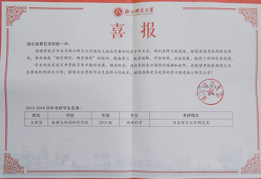 浙江师范大学发来阳新一中校友——王贤新的喜报