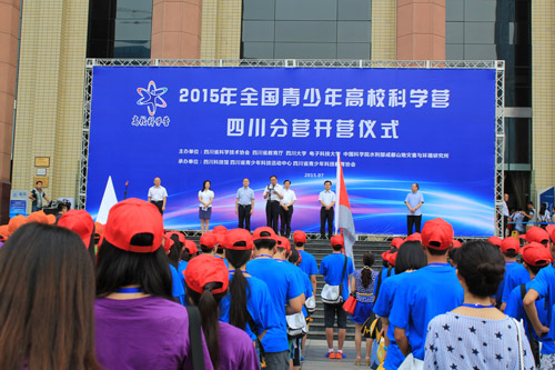 “有朋自远方来,不亦说乎?”四川省科协党组书记吴群刚引用论语中的经典,对营员们表示热烈欢迎。四川达州新世纪学校的侯鳗玲作为营员代表在发言中倡导全体营员全身心地投入到接下来的科学营活动中。9点20分,四川大学校长谢和平、四川省科协党组书记吴群刚、四川省教育厅副厅长何浩分别为四川大学、电子科技大学、中国科学院水利部成都山地灾害与环境研究所授营旗,标志着2015年全国青少年高校科学营四川分营正式开始。