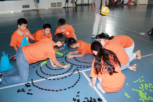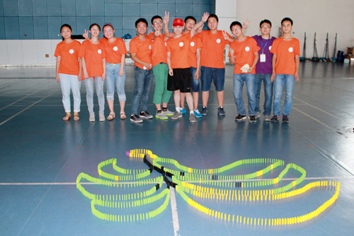 参观完图书馆,营员们走进四川大学江安校区体育馆。在这里,四川大学分营多米诺骨牌创意设计比赛即将举行。这个比赛能够锻炼营员们的动手能力、时间管理能力和创新能力,培养营员们的团结协作精神,提升心理素质。比赛现场,大部分营员都蹲着身子,也有个别营员双膝跪在地上,一块、两块、三块、眼到手到,一块块骨牌在营员们的手上拿起、放下……因为骨牌效应,中间若有一块倒下,很多会相继倒下,便需要重新码放。所以稍不留神,碰倒一块,就不得不做重复的工作,真的是“牵一发而动全身”。不巧的是,有好几个团队都吃了这样的亏。但是,营员们不抱怨、不气馁,总结经验后继续耐心、细致地按照草图摆放骨牌。随着时间一分一秒的过去,一排排整齐的多米诺骨牌汇聚了各团队的劳动和汗水,一个个独特的造型凝结了智慧和创意。四川大学校团委的老师们客观公正地通过综合对比各团队作品的创意、造型、解说和推到率等情况,评选出了冠亚季军。最终,阳新县第一中学的营员们创作的“凤凰涅槃”夺得了本次多米诺骨牌创新设计比赛的冠军,亚军则由四川广安邻水县第二中学的“我和川大”收入囊中,宜城市第三高级中学营员以名为“北斗七星”的作品获得季军。