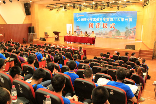 7月25日下午, 2015年全国青少年高校科学营四川大学分营系列活动顺利结束,闭幕式于望江校区文华活动中心成功举行。从开启形式多样的“破冰之旅”,到参观映秀地震遗址学习避震知识,再到漫步金沙遗址感受古蜀文明之魅力,最后与知名学者、优秀大学生的积极互动,营员们在为期六天的活动中,可谓收获颇丰。其中,川大相关学院举办的创新实验活动更是为营员们提供了亲身参与先进科学实验的机会,极大地激发了营员们对科学探索的浓厚兴趣。闭幕式上,四川省青少年科技活动中心的刘西林主任率先致辞。刘主任对川大分营形式多样的科学体验活动给予了充分的肯定,并呼吁营员们将此次活动中的收获转化为学习的动力,砥砺前行,奋发学习。中国科学院成都分院山地研究所的张宁处长、四川大学校团委徐海鑫书记分别宣读了“优秀营员”名单和“优秀带队老师”名单。我校刘志成、陈诚两位同学荣获优秀营员称号。