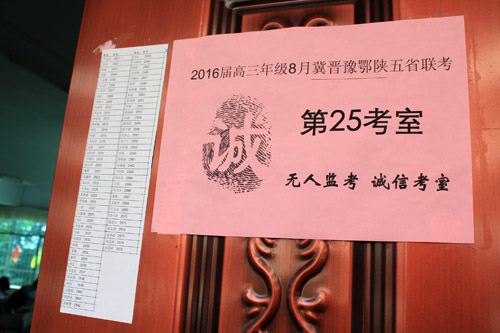 为了进一步开展社会主义核心价值观的教育,培养学生诚实守信的优良品质,在学生中广泛树立诚信典范,我校2016届高三在8月28—29日五省大联考中率先为268名考生开设5个无人监考诚信考场。进入无人监考诚信考场的考生依次经过本人申请、班主任审核、学生签《阳新一中2016届无人监考诚信考场承诺书》、经年级审查同意几个程序,最终确定该生是否能进入无人监考诚信考室参加考试。