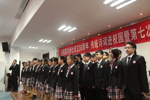 三九寒冬,腊梅怒放。2016年元月17日的腊八节,阳新一中学术报告厅中激情飞扬,有着6年传承的由阳新一中携手阳新县富川诗社联合打造的“腊八诗会传统诗词进校园”活动如期举行,与往年不同的是本届“腊八诗会”恰逢阳新富川诗社成立三十周年庆典,因此显得格外隆重,省市县政界领导和文化界名士悉数到场。湖北省人大常委会原副主任,省诗词学会副会长徐晓春,湖北省中华诗词学会会长黄金辉,黄石市西塞山诗社社长李声高,阳新县县委常委、宣传部部长徐德世,副部长张建长,阳新一中校长明道树,阳新县文体局副局长胡逸祥等在主席台主座。