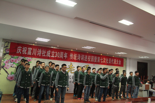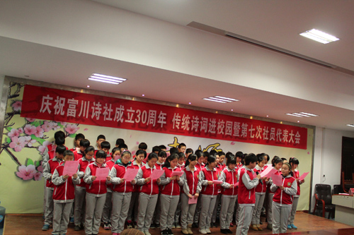在完成了富川诗社换届选举议程之后,浓墨重彩的点睛之笔是由阳新一中实验班学生表演的传统诗词呤诵,同学们着装整齐,声情并茂,气势长虹,余音绕梁,振人心魂,会场顿时进入高潮,掌声雷动,经久不息,本次活动取得圆满成功。