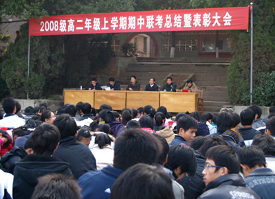 置,于12月4日下午2点30分在学校篮球场召开了高二年级期中总结表彰大会。出席大会的有阳新一中校长赵立忠、副校长柯美宝,主管高二年级的潘龙星校长、李朝忠主任、陈洪云书记,政教室肖绪曙主任以及高二年级全体班主任,学生。
