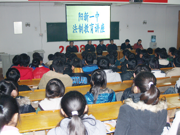 20091224下午,我校以阶梯教室为主会场,通过校园语音系统向高一所有教室广播的方式召开了高一年级法制教育大会。会议邀请公安局上街派出所曾凡胜同志、县司法局基教科黄龙兵科长先后就未成年人犯罪问题作了案例剖析,以案说法,生动感人,教训深刻。