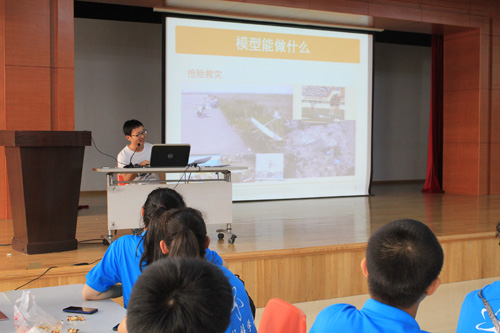 上午8:30,营员们在志愿者的带领下,聆听航模培训,了解航模制作的注意事项和各种技巧。本次培训由航模协会的志愿者主讲。在培训过程中,主讲人耐心细致地向营员们讲解航模知识,用形象的旁例解释抽象的概念;营员们认真聆听,及时记录,为下午的航模制作做准备。志愿者们还向营员们展示了自己的作品,引得营员们纷纷叫好,现场气氛十分活跃。