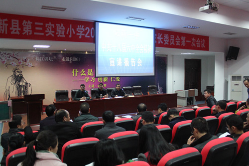 2016年12月20日晚7:00在我校学术报告厅召开了中共十八届六中全会精神宣讲报告会。学校纪检组长方长风主持会议,邀请阳新县委宣传部副部长陈前波为全校中层以上干部、班主任和党员教师作宣讲报告。