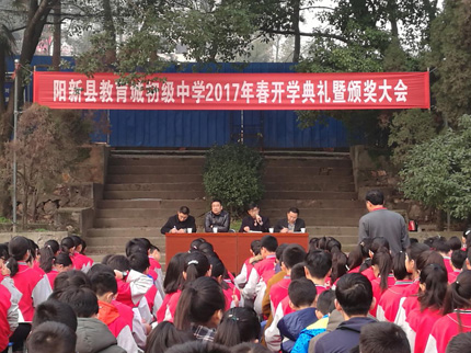 2月17日上午八点整至九点整阳新县教育城初中在水泥篮球场隆重举行了新学期开学典礼暨上学期期末考试表彰大会,出席大会的有:阳新一中党总支书记、校长明道树,阳新一中党总支委员、工会主席、教育城初中分管领导肖绪曙,教育城初中主任陈世明,副主任钟周及初中部全体师生。会议由明平发副主任主持。