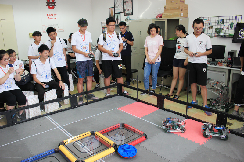接下来,营员们在学长学姐带领下参观了智能机器人实验室。周光亮学长向营员们介绍了Robocup机器人比赛和机器人的控制原理,并操控机器人向大家展示了机器人射门、倒地再起等精彩动作。在VEX实验室中,韩哲简学长简要介绍了比赛规则,薛嘉琦学姐则向大家展示了机器人发球,带领营员们展开了一场激烈的机器人追逐战。营员们积极参与其中,与学长学姐们交流问答,享受着科技的魅力和其带来的快乐便捷,我们体会到了机器人的神奇与美妙。