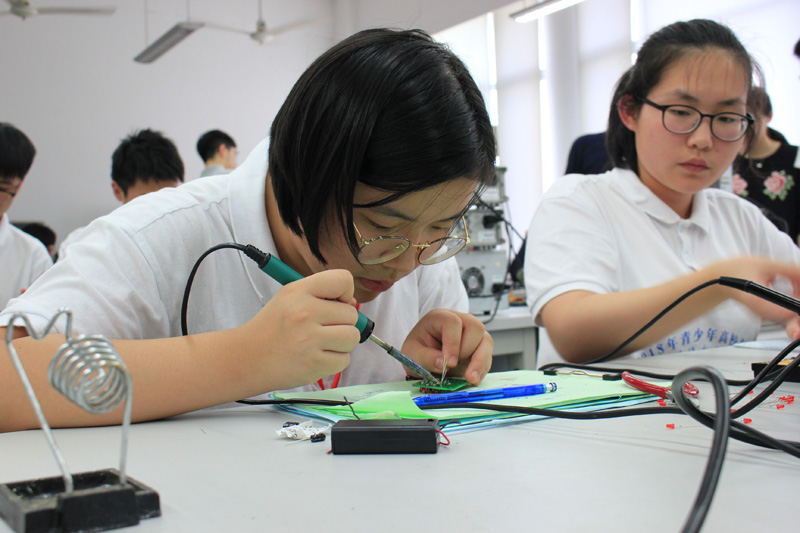 做完 stem,我们于下两点钟进入电子与信息工程学院重点实验室做电子设计知识创造,目标是制作一个微型电路。在教授细致而全面的讲解下,我们大概懂了基本原理。所用的材料是一块酚醛树脂基板,18 个发光二极管,3 个多电容,3 个三极管,6 个电阻,锡丝等。 所用工具有焊台, 欧姆表,钳子等。 刚开始手忙脚乱,但我们很快适应了工序,不慌不忙有条不紊地做起来 。