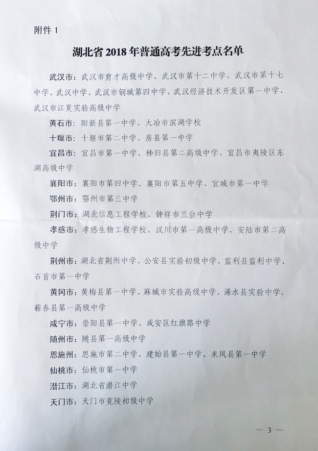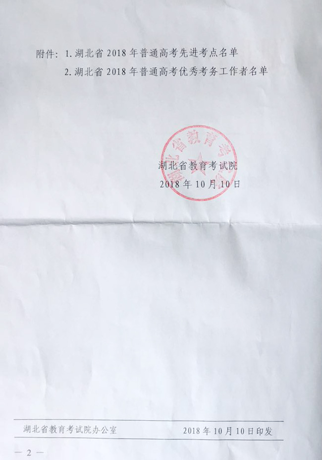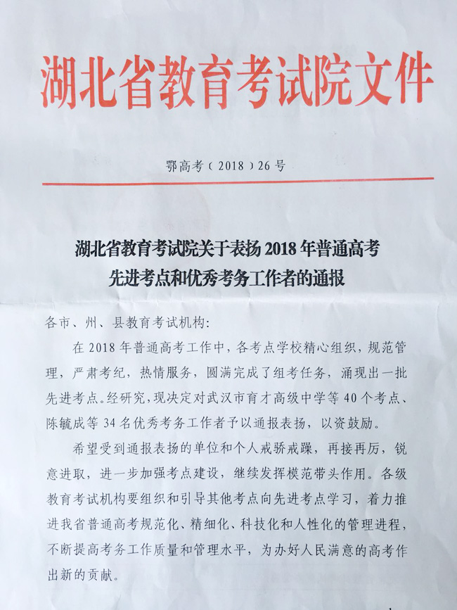10月10日,湖北省教育考试院印发了《湖北省教育考试院关于表扬2018年普通高考先进考点和优秀考务工作者的通报》,我校被评为湖北省2018年普通高考先进考点。