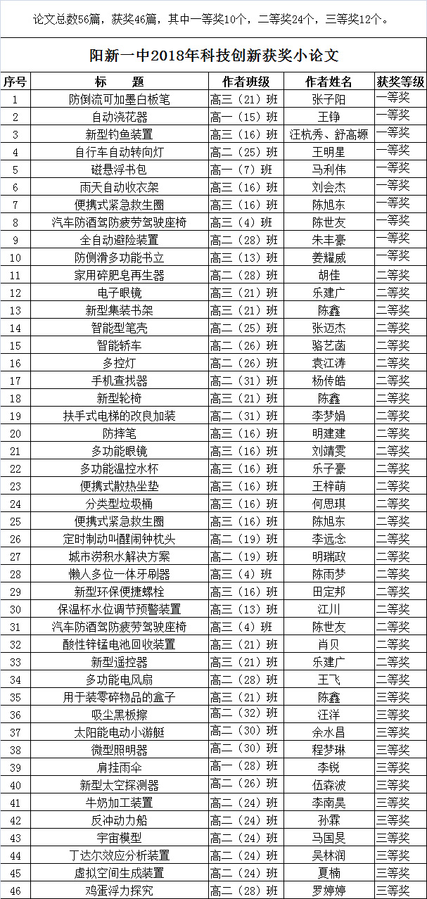 “三小”(小发明、小制作、科技小论文)创作是体育科技文化艺术节的重要内容之一,旨在激发学生爱科学、学科学、用科学的兴趣,培养学生的创新精神和实践能力。11月23日晚上7:30,学校在学校新校区至善楼组织专家对本次体育科技文化艺术节收集的科技创新作品进行了评选。论文总数56篇,获奖46篇,其中一等奖10个,二等奖24个,三等奖12个。科技小制作、小发明类产生一等奖2名、 二等奖4名。现将结果公布如下: