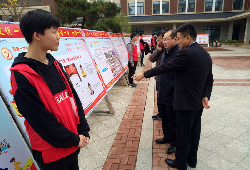 校长明道树(右一)陪同市科协副主席彭振林(中间)、市科技馆副馆长王磊(右三)参观学校科技活动展板