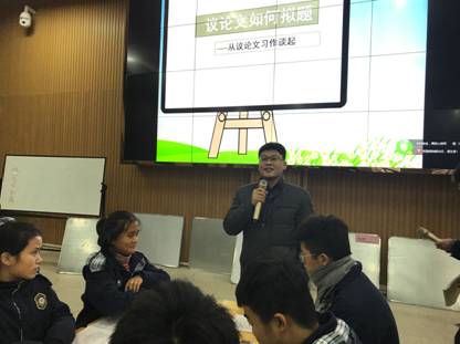 此次研讨会分设研讨课和主题报告两个环节。研讨课由阳新一中陈湖庚老师和黄石四中戚佳莉老师主讲。陈老师从“如何拟题”的角度,结合自己的教学实际和学生的平时习作案例导入,循循善诱,深入浅出;戚老师从“如何切题”的角度,以上次黄石语文联考作文题目为例,结合学生的考场作文案例导入,洞幽烛微,切中肯綮。