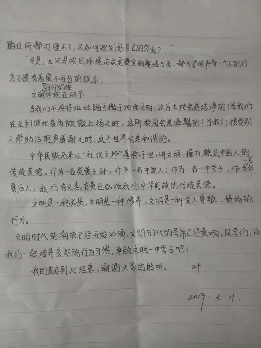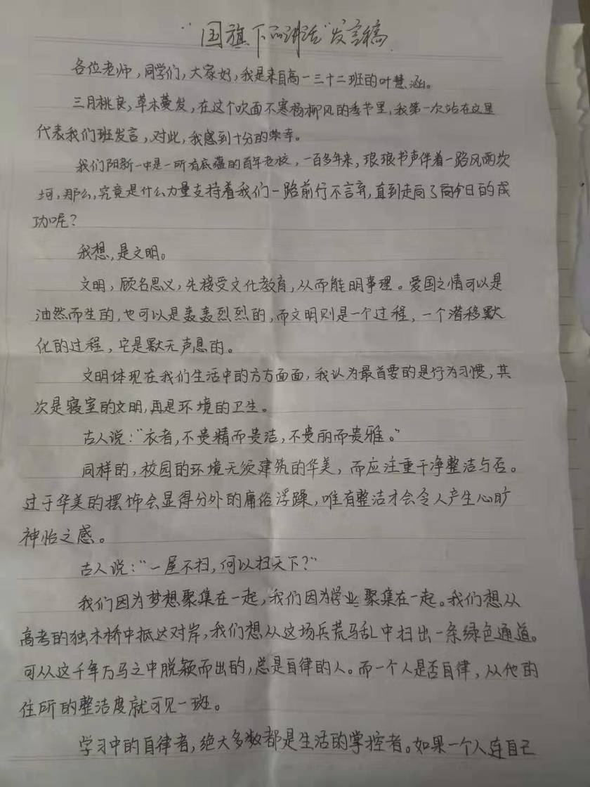 2019年3月11日早上7:00,春意盎然,在雄壮的国歌声中,五星红旗冉冉升起,阳新一中老校区高一年级在运动场开展“国旗下的讲话”的活动,活动主题为“创全国文明校园,做文明守纪一中人”。阳新一中党委委员、副校长王能勇作了主题为“坚定目标求进步,良好习惯促成长”的讲话。年级组柯建中主任宣布了二月份年级量化考核优胜班级,年级领导给优胜班级颁奖。高一(32)班学生叶慧涵代表高一年级上台作了主题为“养成良好习惯,争做文明学子”的发言。高一3部12个班的全体学生和全体班主任积极参加了活动。活动由行政办主任、年级支部书记曾德东主持。(洪汉友供稿)