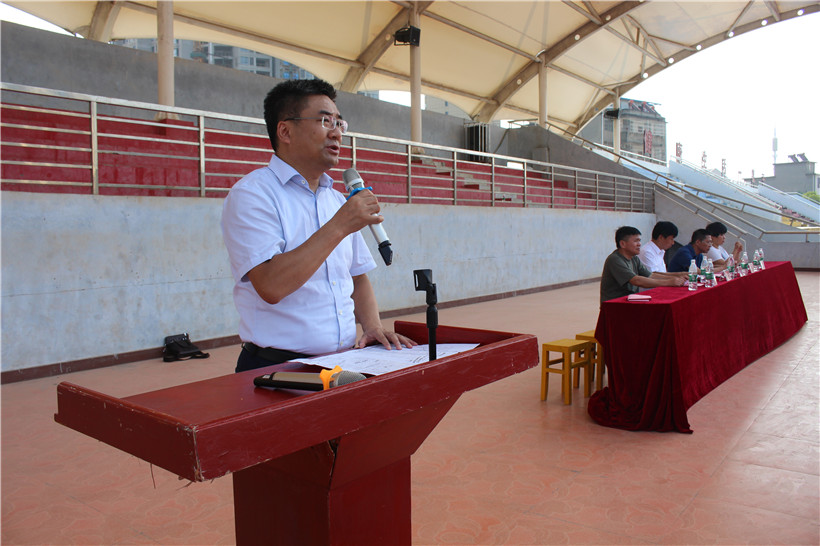 阳新一中党委书记、校长明道树在大会上致辞。明校长详细介绍了阳新一中的办学思想体系,高度肯定了学校近几年取得的辉煌成绩,热烈欢迎高一新生来阳新一中求学深造,希望同学们在六天的军训中严于律己、刻苦训练、练有所获,勉励广大学子在高中学习中要继承和发扬阳新一中精神——爱国好学、奋发自强、团结拼搏、勇争第一。