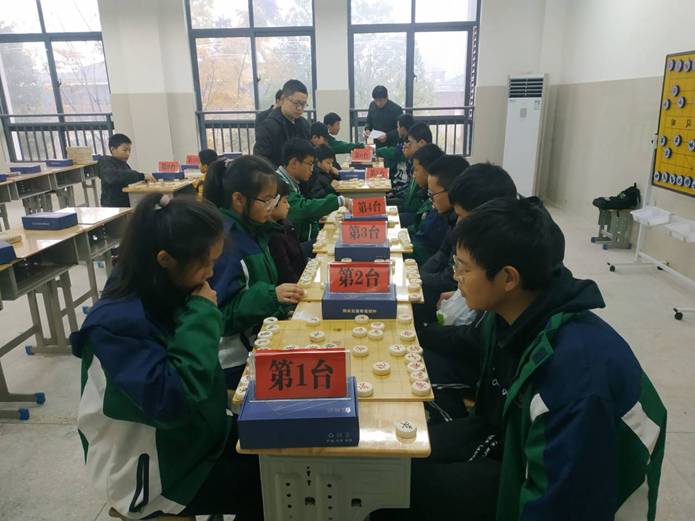 为了丰富学生周末业余爱好, 积极推动我校学生身心的健康发展 , 弘扬传统国粹文化,12月21日下午2:00由团委明道立德棋社在启智楼二楼学生社团活动室举行象棋比赛活动,本次活动由柯俊老师倾力主持,邢太柏老师前来指导,两位老师为了此次活动顺利高效进行牺牲自己的休息时间,为他们的点赞。高一学生踊跃参加,热情高涨,对弈场面很火热。本次活动由校团委副书记郑安利宣布比赛开始!比赛中参赛选手坚持友谊第一,比赛第二的宗旨,使比赛始终在友好和谐的氛围中火热进行,精彩的对弈吸引了众多棋友观看助阵。