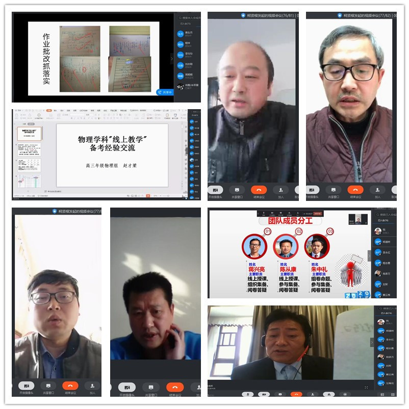 会上新校区高三年级教师程志勇(语文)、饶雄(数学)、何祥坤(英语)、赵才梁(物理)、曹阳(化学)、宋仕豪(生物)、邢庭水(政治)、蒋兴亮(历史)、焦龙河(地理)等九位老师代表各备课组围绕线上教学,从学科实际出发,务实而微观,介绍了他们如何组织线上教学,如何推进复习备考,如何分工协作,同时进行深刻反思,以期进一步优化我校线上教学。