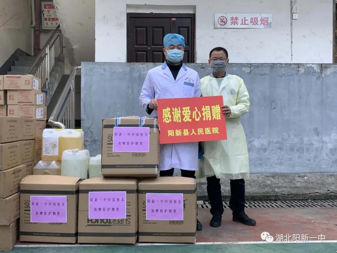阳新一中1997届校友在得知阳新县人民医院防护物资告急的情况之后,汪烈鑫、何洁琦、明文剑等马上牵头筹措资金,大家爱心汇聚,合力购置3万余元防护物资及时送到阳新县人民医院,为医院一线抗疫人员解决燃眉之急。