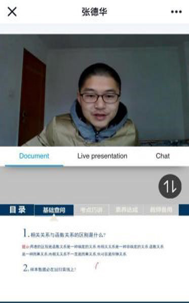 注重实效巧改进。结合学生居家学习的实际情况,张德华老师一方面考虑到部分学生居家学习未带纸质资料和书本,又和其他老师快速整理出资料电子档,并发布网络课本电子档链接;另一方面考虑到直播的效果,将面对几百人授课,张老师又带领数学组坚持每周两次集备集研,讨论本周工作安排和重点,积集体智慧,为线上教学提供持久动力。同时对每次直播课内容进行深入研讨,他认为每一次直播就是一次表演,必须精心准备。他总是提前告知学生授课内容,要求学生做好听课准备,了解学生诉求,针对学生实际开展直播教学。力求做到每堂课做成ppt网络直播,因此。他的直播课总能吊住学生胃口,很受欢迎。