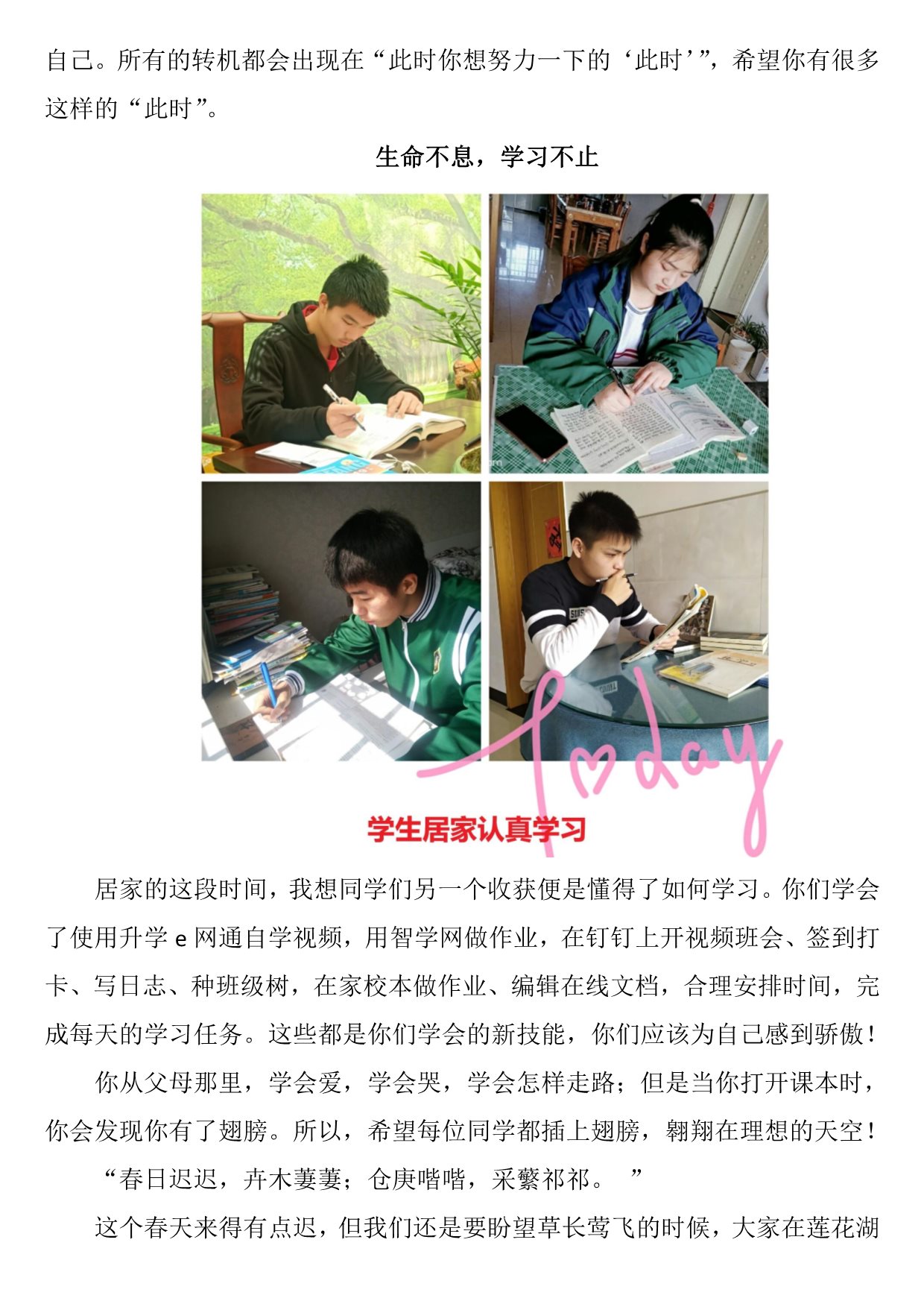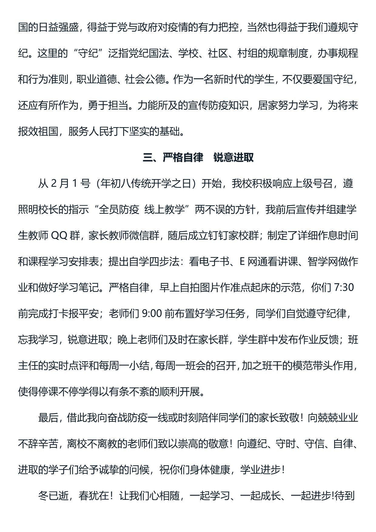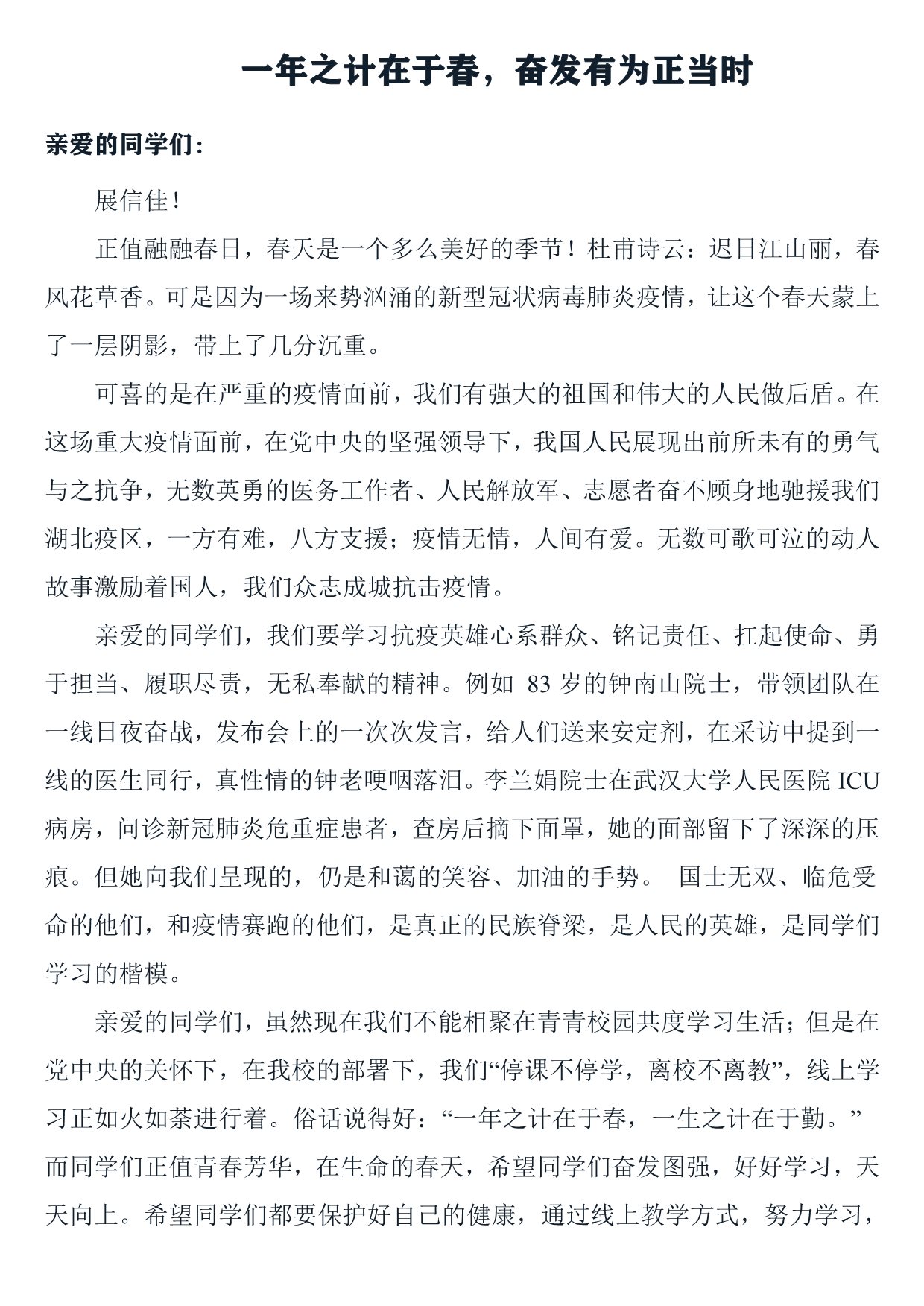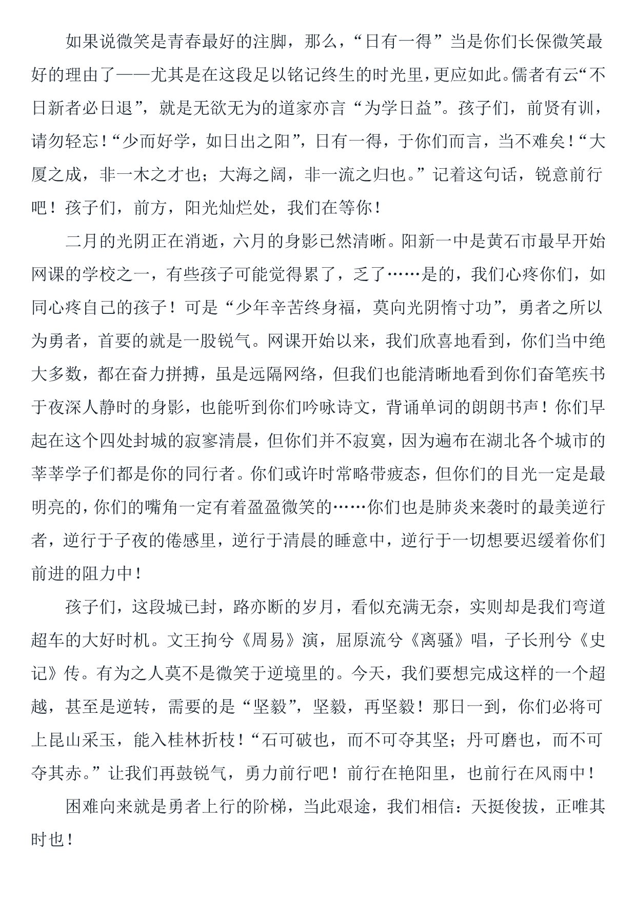 亲爱的同学们,居家学习的这些日子,不知你过得可好!是否在细雨淅沥眺窗外、暖阳融融望蓝天的时候,会想起碧柳拂玉水、蜂蝶绕红梅的青青校园?是否在禁足小区、闭门不出的时候,怀念龙翔凤翥徜徉明道楼的自由又自在?是否在随老师听直播授课、与同学聊开学返校的时候,想早些看到老师们亲切的笑容和同学们可爱的模样?是否在关注家国大事、心系全民防疫的时候,开始认真思考道德讲堂那堂班会课上、茵茵绿场那次国旗下的讲话中谈及的爱国与责任、生命与成长?