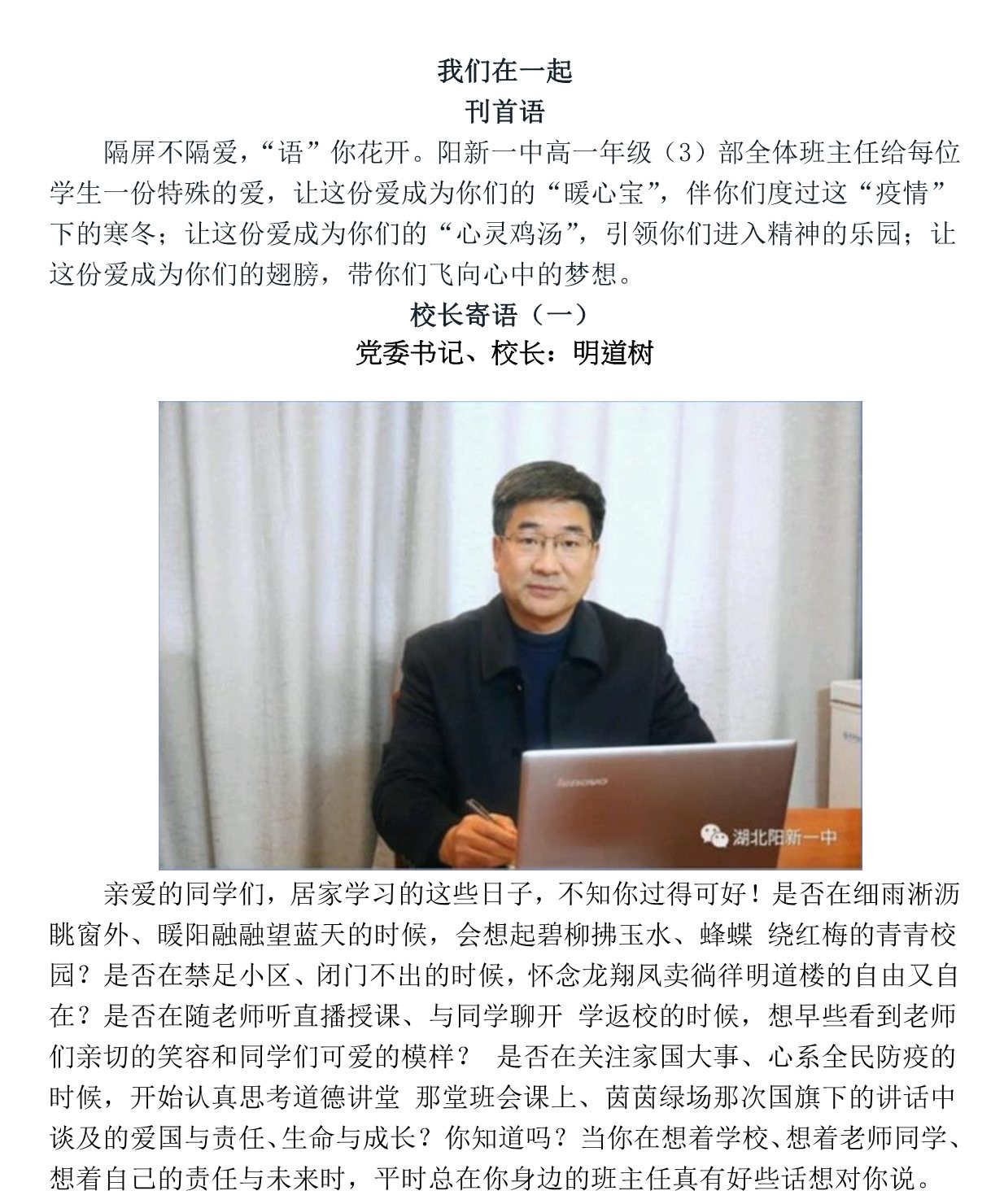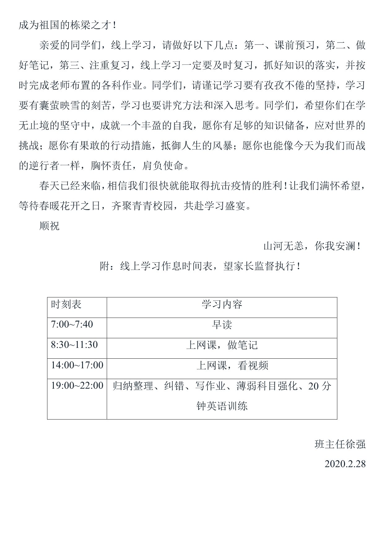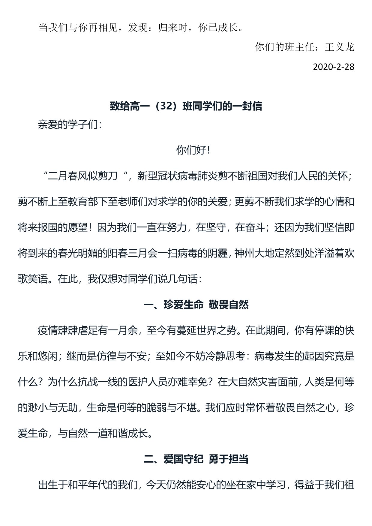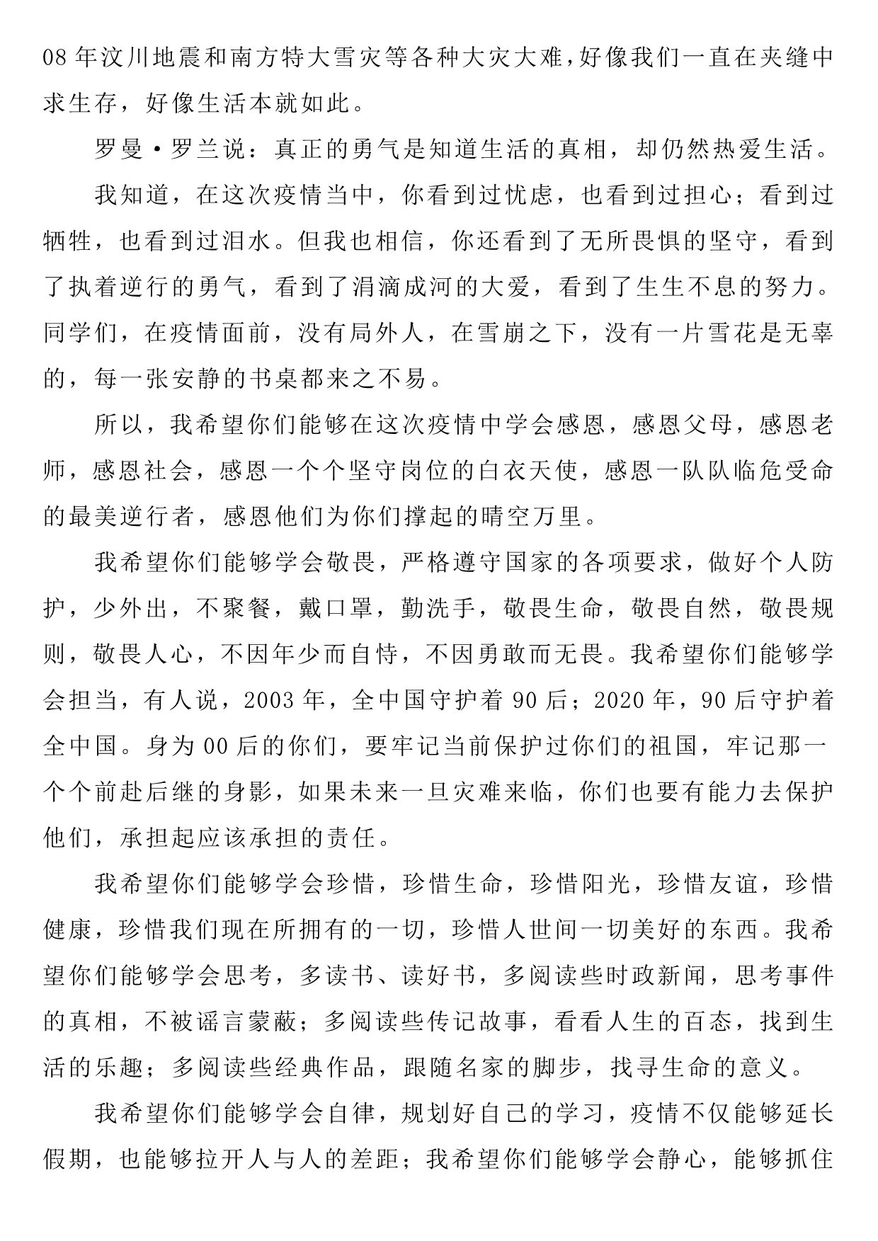 亲爱的同学们,居家学习的这些日子,不知你过得可好!是否在细雨淅沥眺窗外、暖阳融融望蓝天的时候,会想起碧柳拂玉水、蜂蝶绕红梅的青青校园?是否在禁足小区、闭门不出的时候,怀念龙翔凤翥徜徉明道楼的自由又自在?是否在随老师听直播授课、与同学聊开学返校的时候,想早些看到老师们亲切的笑容和同学们可爱的模样?是否在关注家国大事、心系全民防疫的时候,开始认真思考道德讲堂那堂班会课上、茵茵绿场那次国旗下的讲话中谈及的爱国与责任、生命与成长?