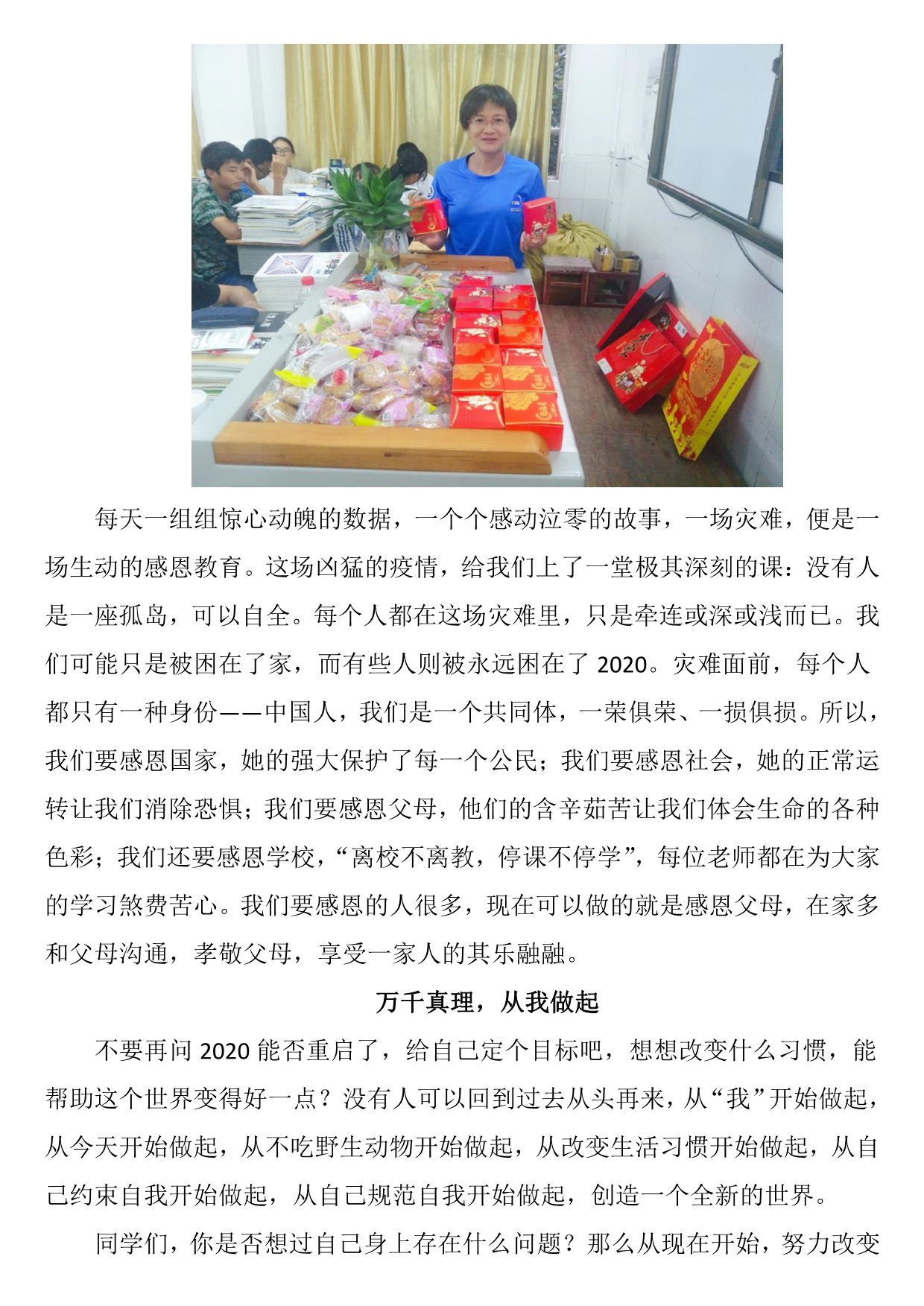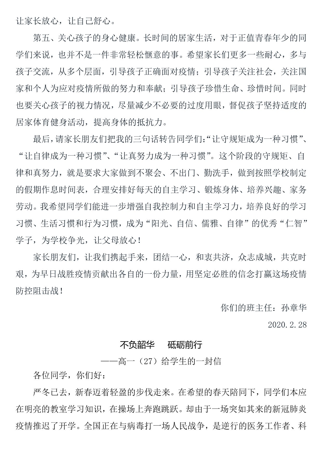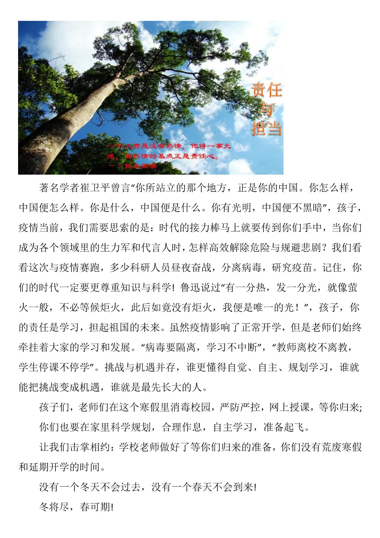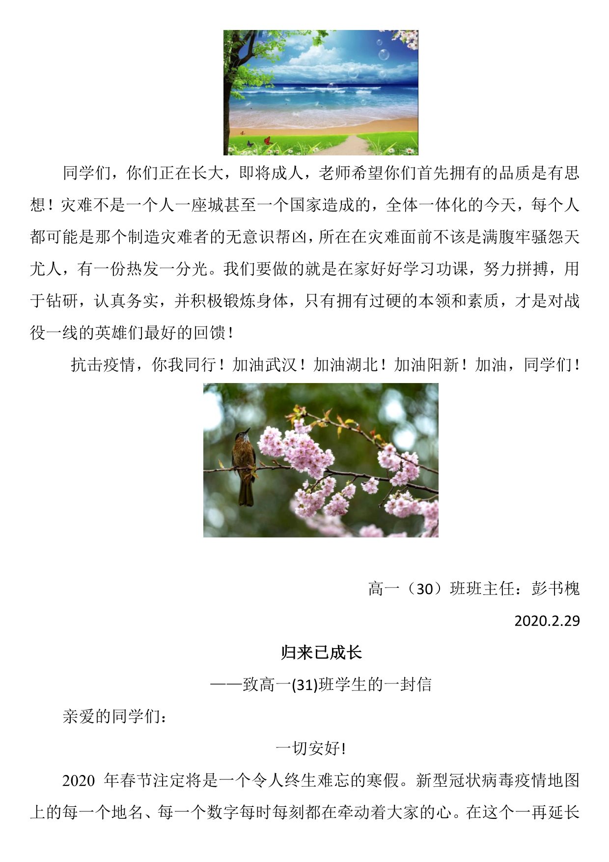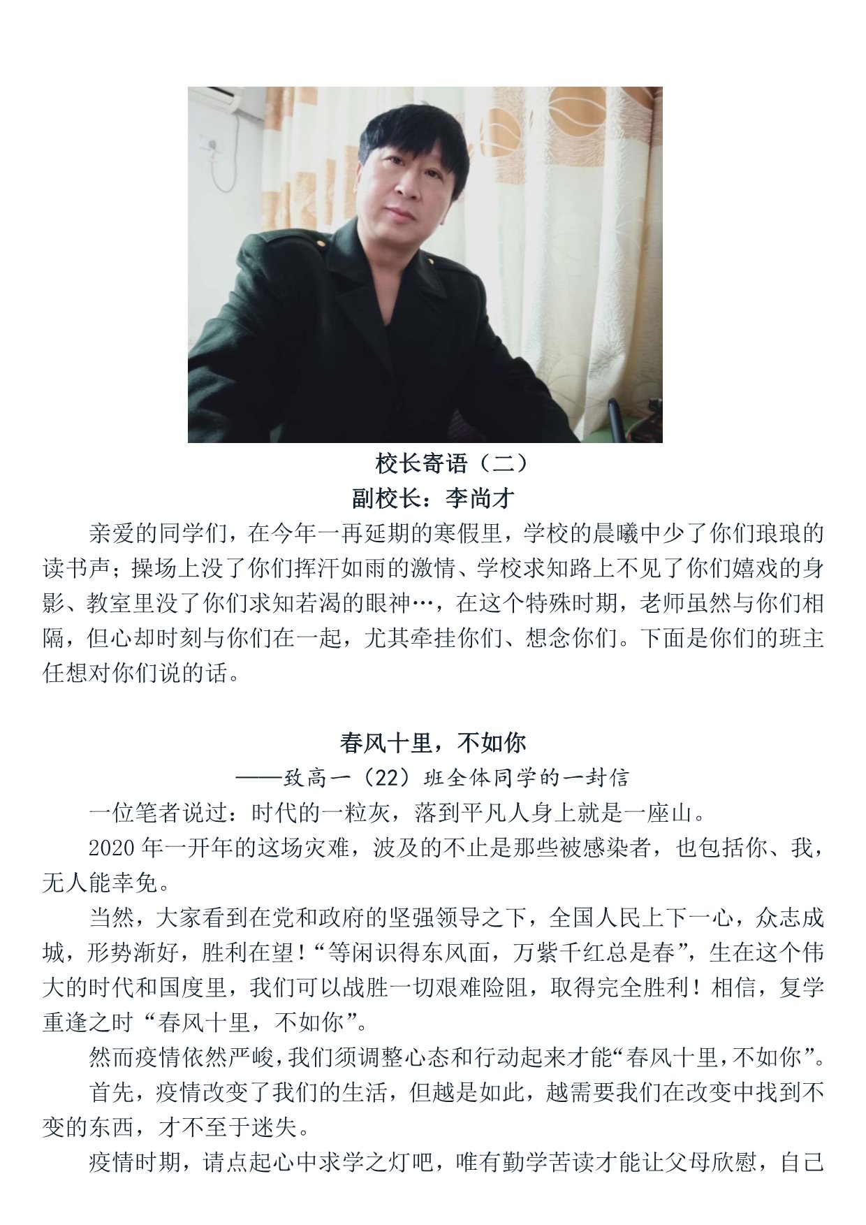 亲爱的同学们,居家学习的这些日子,不知你过得可好!是否在细雨淅沥眺窗外、暖阳融融望蓝天的时候,会想起碧柳拂玉水、蜂蝶绕红梅的青青校园?是否在禁足小区、闭门不出的时候,怀念龙翔凤翥徜徉明道楼的自由又自在?是否在随老师听直播授课、与同学聊开学返校的时候,想早些看到老师们亲切的笑容和同学们可爱的模样?是否在关注家国大事、心系全民防疫的时候,开始认真思考道德讲堂那堂班会课上、茵茵绿场那次国旗下的讲话中谈及的爱国与责任、生命与成长?