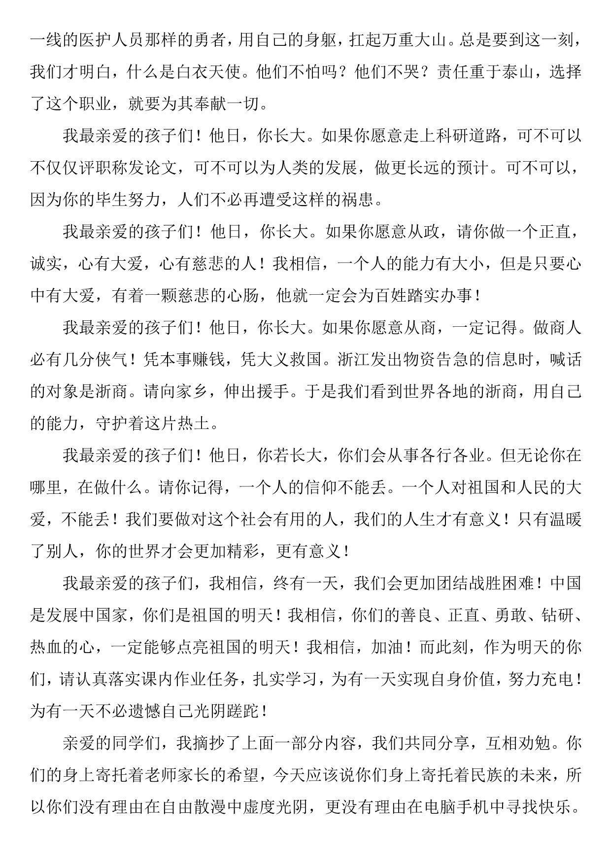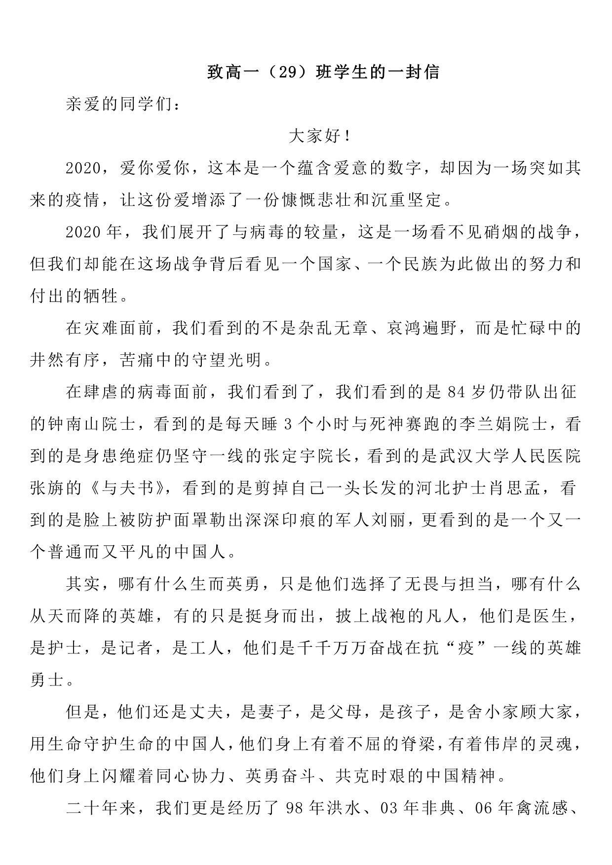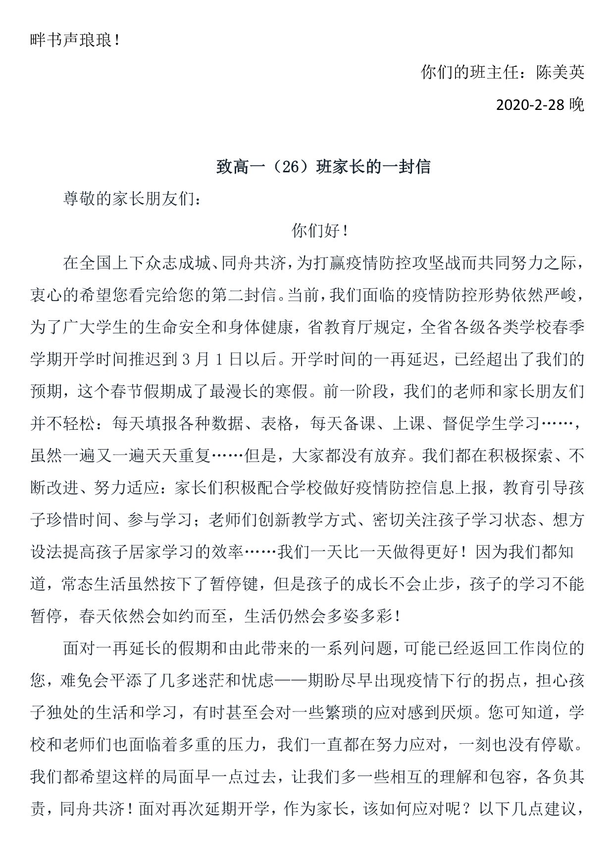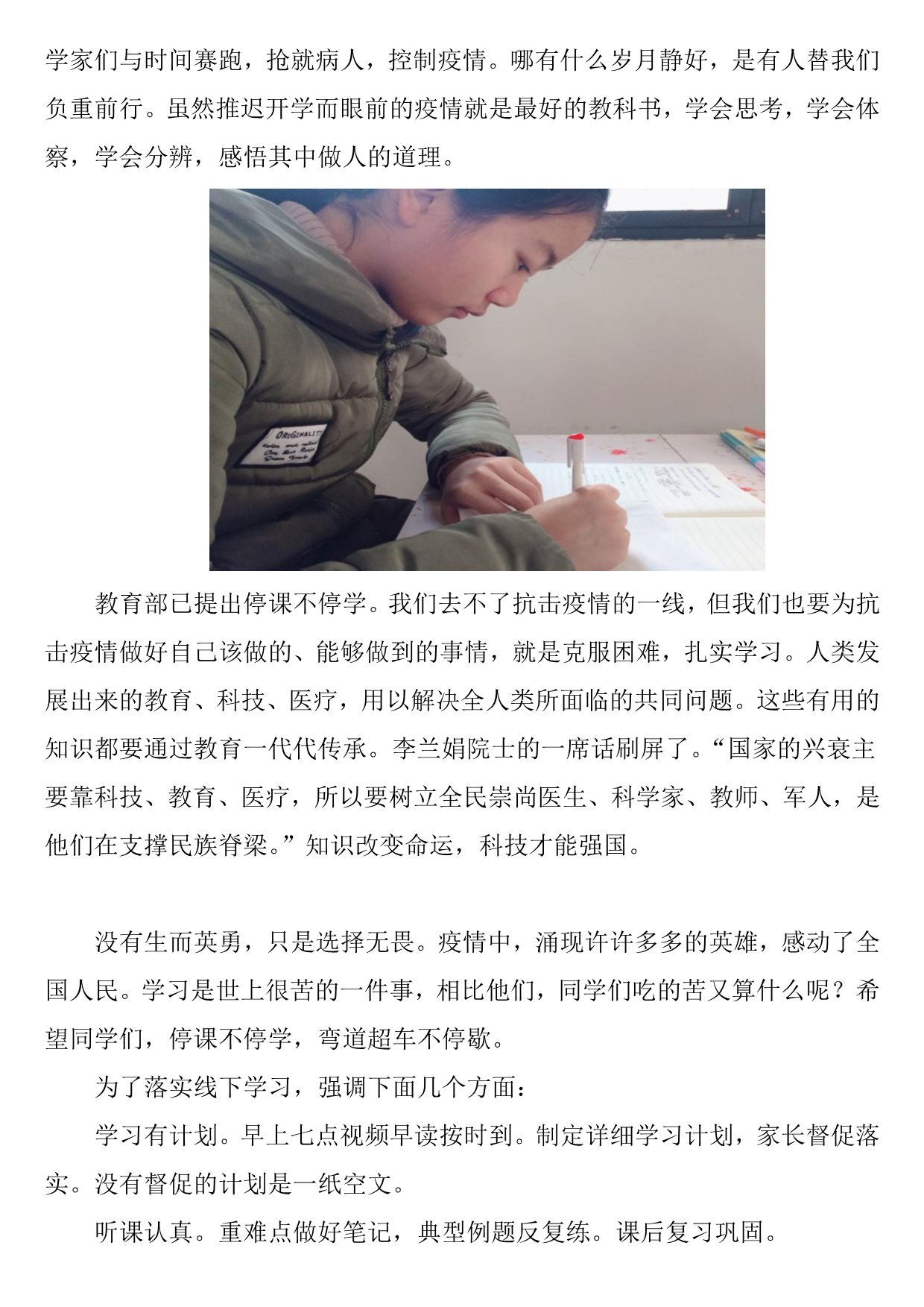 亲爱的同学们,居家学习的这些日子,不知你过得可好!是否在细雨淅沥眺窗外、暖阳融融望蓝天的时候,会想起碧柳拂玉水、蜂蝶绕红梅的青青校园?是否在禁足小区、闭门不出的时候,怀念龙翔凤翥徜徉明道楼的自由又自在?是否在随老师听直播授课、与同学聊开学返校的时候,想早些看到老师们亲切的笑容和同学们可爱的模样?是否在关注家国大事、心系全民防疫的时候,开始认真思考道德讲堂那堂班会课上、茵茵绿场那次国旗下的讲话中谈及的爱国与责任、生命与成长?