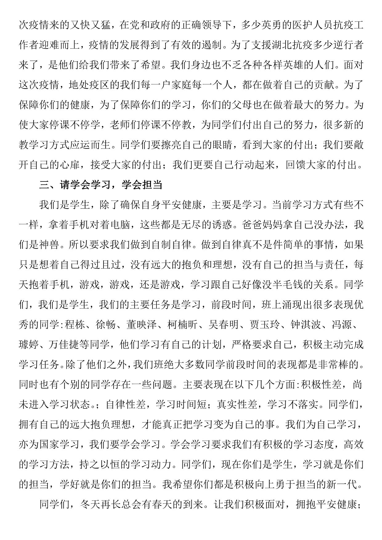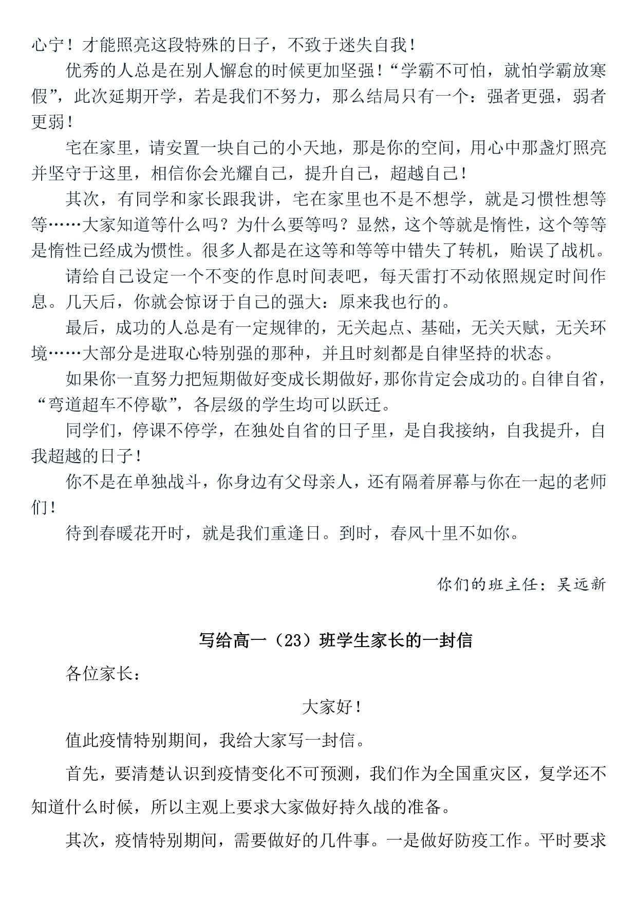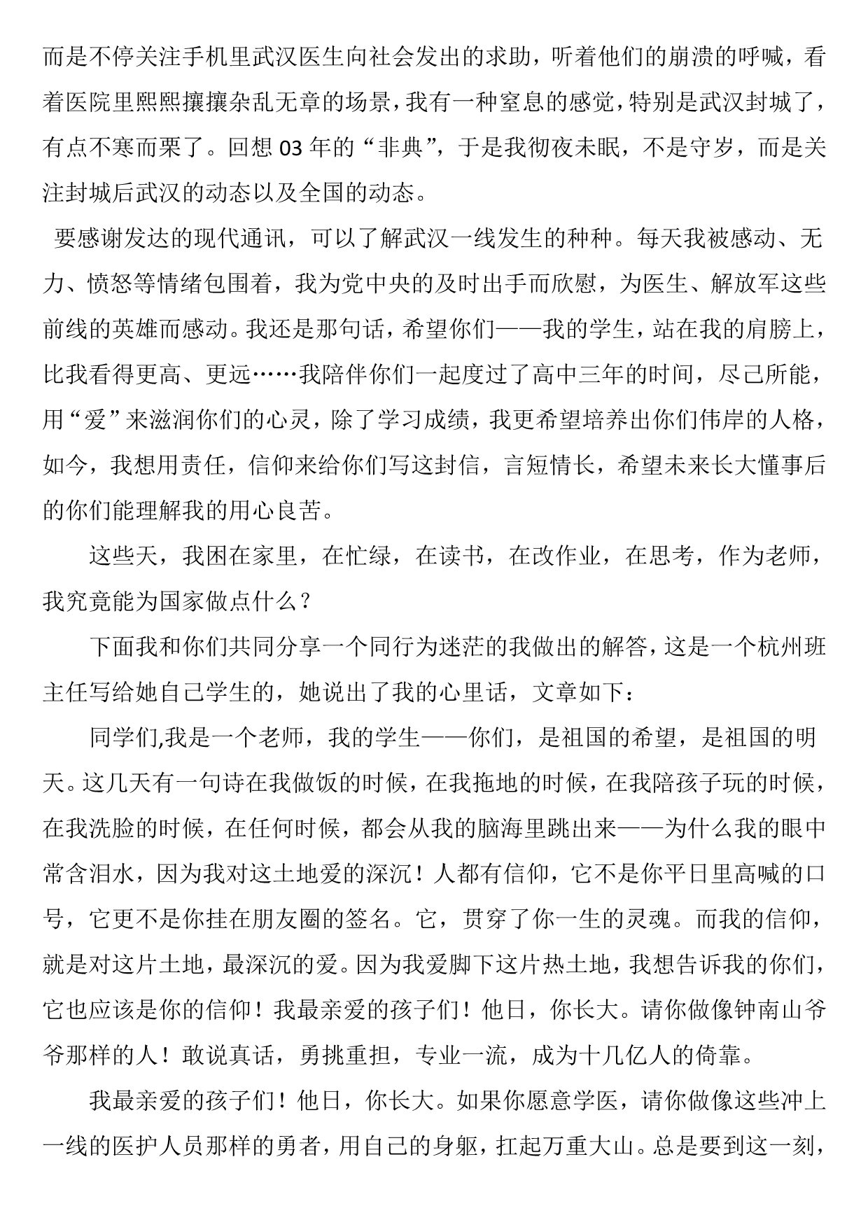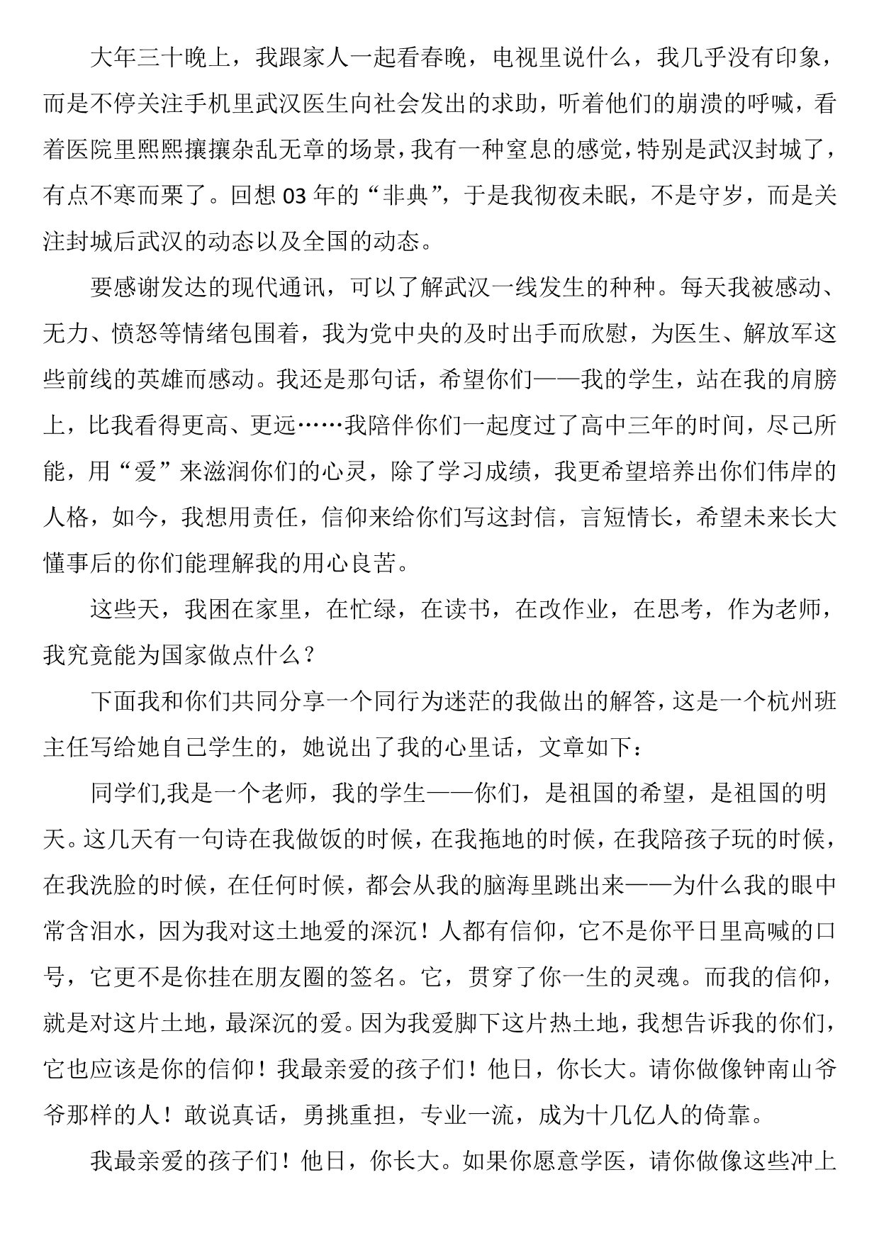 亲爱的同学们,居家学习的这些日子,不知你过得可好!是否在细雨淅沥眺窗外、暖阳融融望蓝天的时候,会想起碧柳拂玉水、蜂蝶绕红梅的青青校园?是否在禁足小区、闭门不出的时候,怀念龙翔凤翥徜徉明道楼的自由又自在?是否在随老师听直播授课、与同学聊开学返校的时候,想早些看到老师们亲切的笑容和同学们可爱的模样?是否在关注家国大事、心系全民防疫的时候,开始认真思考道德讲堂那堂班会课上、茵茵绿场那次国旗下的讲话中谈及的爱国与责任、生命与成长?