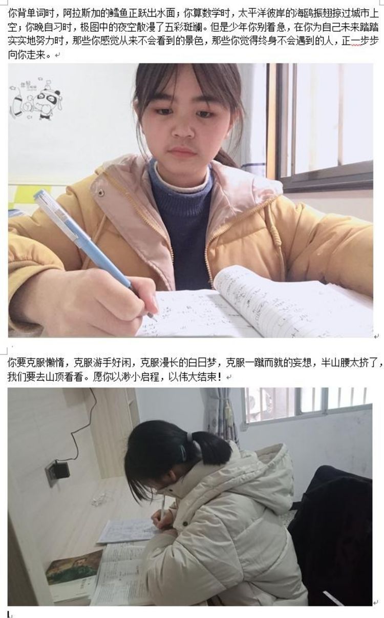 班主任熊先旺寄语:书山路漫漫,勤为首,学海苦茫茫,苦当先。珍惜当下,从小事做起,不积跬步无以至千里。时时用功,步步踏实,用勤劳和汗水编织绚烂的青春。