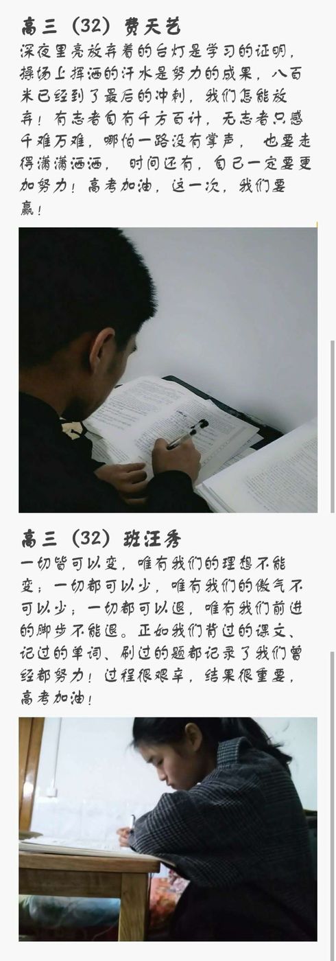 班主任胡文斌寄语:成绩和劳动是成正比例的,有一分劳动就有一分成绩。生于“非典”,考于“新冠”的你们,经历两个多月的居家学习,只有通过自强不息的精神来提高应战高考的实力,依靠自己,战胜自己,成就自己,抗拒一切诱惑,执着追求梦想,奇迹就可以创造出来!