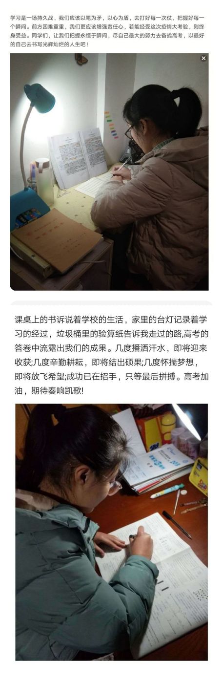2020年的春天,疫情阻挡人们出行的脚步,也阻挡了学生迈进校园的步伐,却无法阻挡学生追梦的执着,无法阻挡教师圆梦的情怀。学生停课不停学,教师离校不离教。 高三3部在陈香花副校长带领下,教学工作开展得有条不紊。时刻紧盯目标,紧跟步伐,紧追标兵,紧跟形势变化,线上线下教学逐步全面推行,大课小课分步全程推进,典型引领,全员齐上,全力冲刺。高考备考如火如荼,各班涌现出一批不甘落后,积极向上的线上居家学习“小明星”。