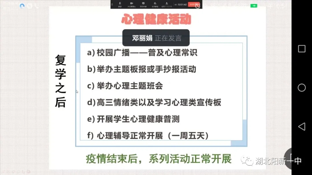 三名班主任程志勇、李鑫、李玲玲分别代表各年级汇报了开学以来的线下德育工作,交流育人心得。学生发展中心德育室主任柏晓辉、综治办主任王平心、文明办主任明建华、团委书记胡琼、女工委主任邓丽娟等分别介绍了复学德育工作开展筹备情况,从健康管理、校园封闭管理、志愿者服务、文明创建等方面作了详细解说。