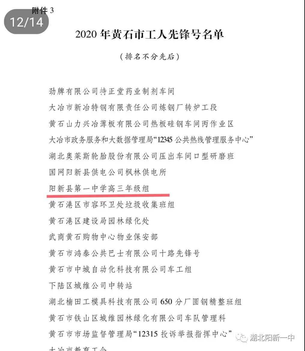 近日,黄石市总工会下发《关于表扬2020年度黄石市市五一劳动奖和工人先锋号的决定》,授予黄石市五一劳动奖状、黄石市五一劳动奖章、黄石市工人先锋号等多个荣誉。其中,我校高三年级荣获黄石市工人先锋号。这是我校2019年获黄石市五一劳动奖状后的又一个劳动节表彰。
