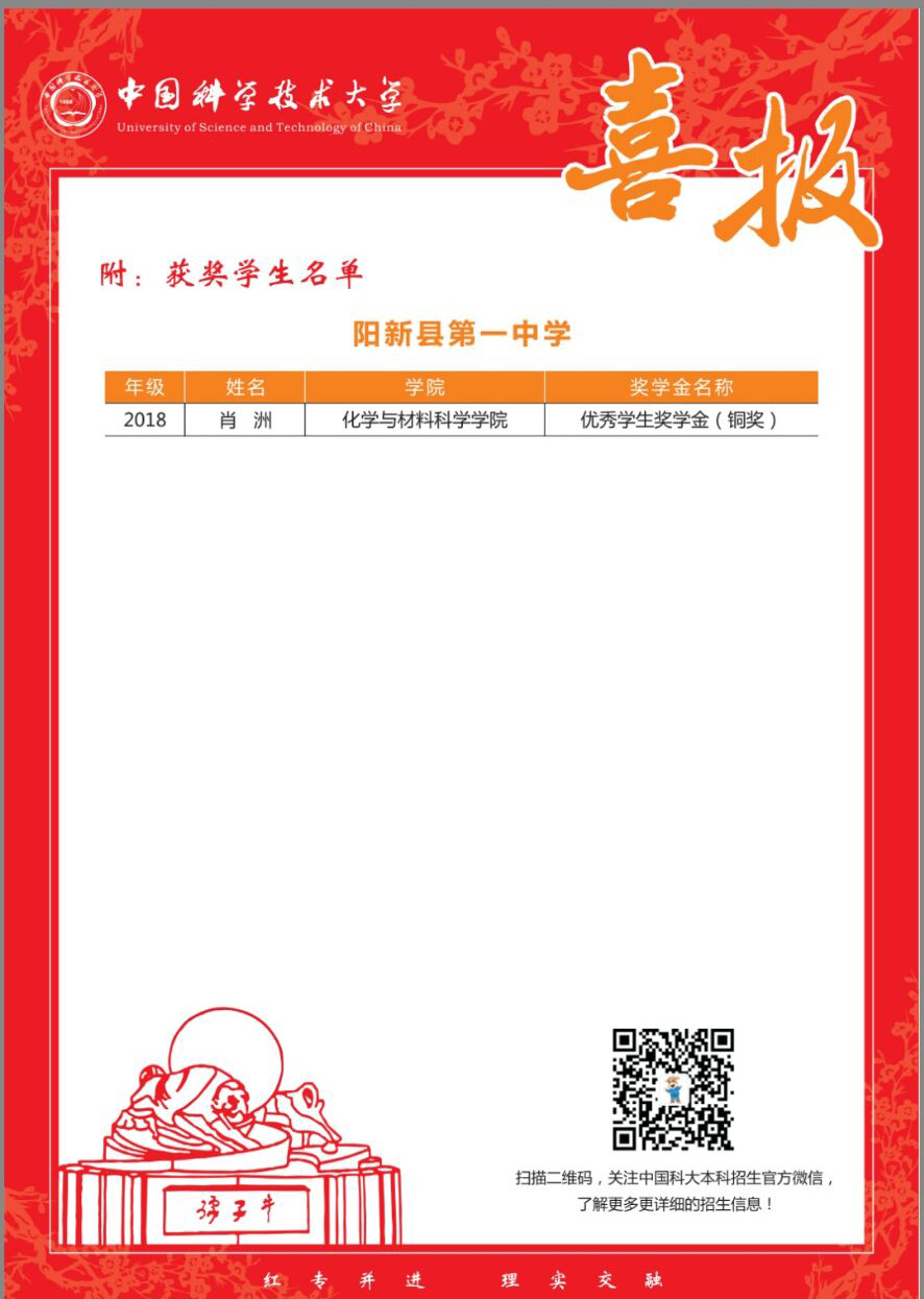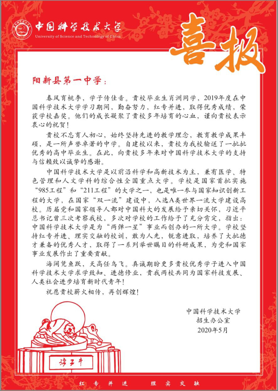 中国科学技术大学发来喜报
