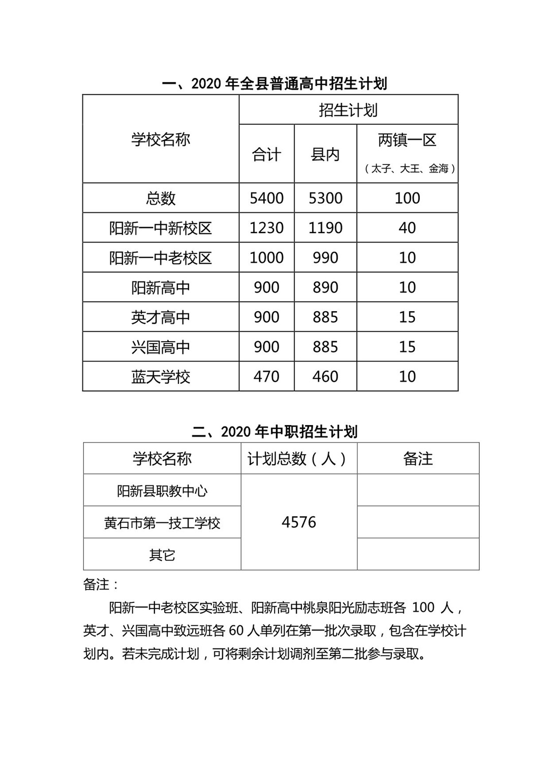关于下达2020年阳新县高中阶段学校招生计划的通知