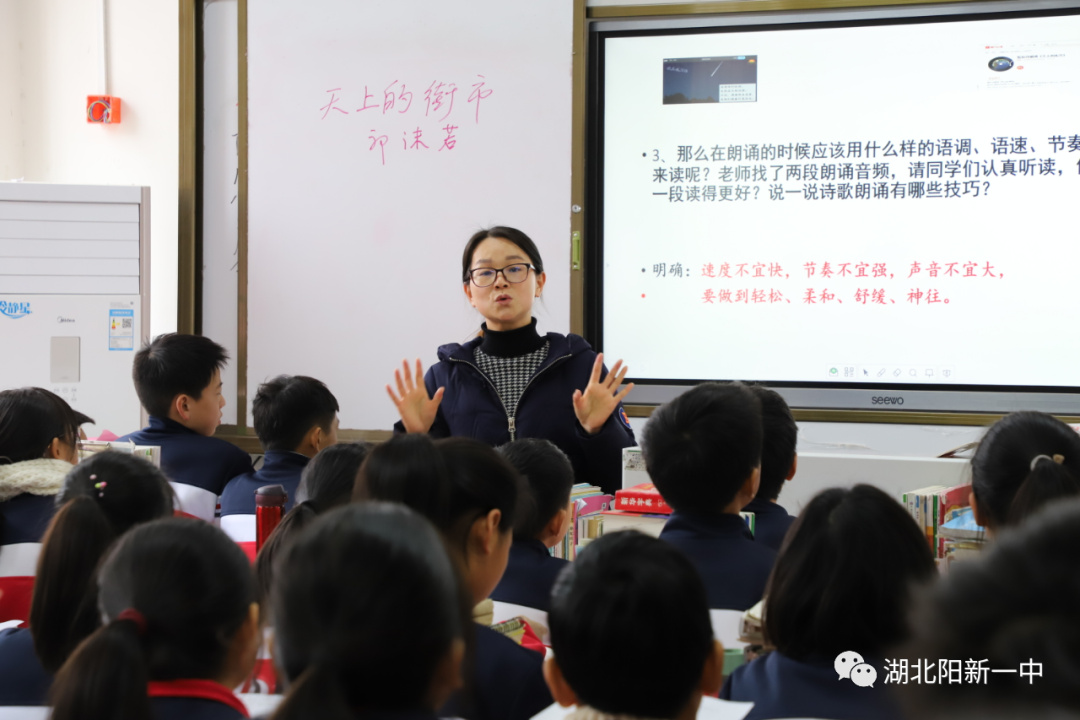 明道树名师工作室成员章丹老师为七年级的学生讲授的是郭沫若《天上的街市》。这是一堂精彩纷呈、生动有效的诗歌教学课。章老师从“如何诵读现代诗”的角度切入,在小组合作探究中引导学生把握诗人情感。课堂上,章老师教态自然,教法新颖,亲切中不乏严谨,生动中不失高效;学生活跃,气氛热烈,时而小组合作,时而观点针锋。精彩的课堂,获得全体学生和听课老师的认可。