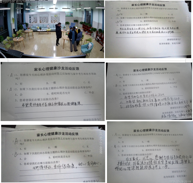 活动结束后,姜老师对家长进行了活动回馈的调查,所有的家长均表示这次的家长心理健康沙龙活动对自己很有帮助,并表示如有其它主题的心理沙龙活动将会继续参加,也有家长表示希望学校多多开展沙龙活动,同时也多给学生增加心理课程,并提议能否让学生和家长一起参加,面对面的共同面对问题效果应该会更好。最后,部分家长留下来继续向姜老师询问相关的一些问题。