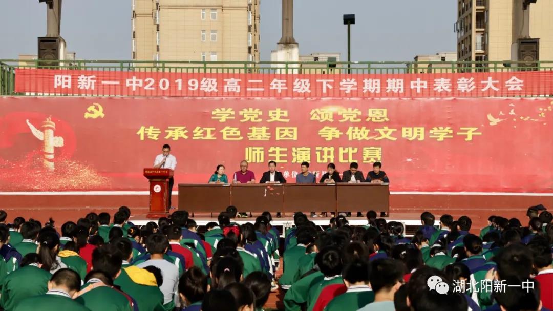 阳光灿烂,惠风和畅。在“五一”国际劳动节当天,阳新一中高二年级在运动场举行了期中总结表彰大会。会议由高二年级主任陈洪星主持,副校长梁师稳、高二年级全体班主任和1200名学生参加会议。