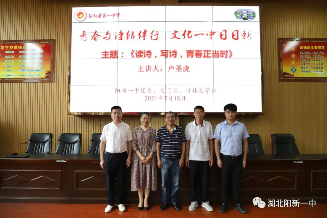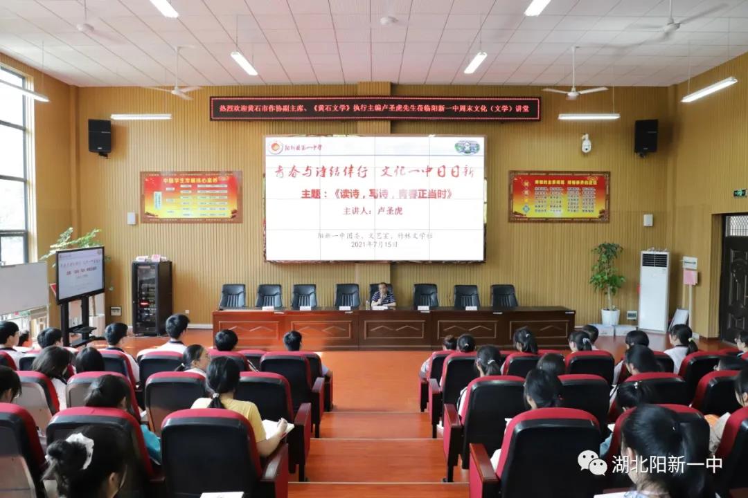 青春与诗结伴行,文化一中日日新。15日下午,黄石市作协副主席、《黄石文学》执行主编、诗人卢圣虎在阳新一中明德楼道德讲堂作《读诗,写诗,青春正当时》主题讲座。阳新一中高二年级300余名师生聆听讲座。讲座由阳新县楹联协会副会长王细平主持,县政府办副主任彭书桃作点评。阳新一中团委、文艺室、竹林文学社筹划、组织。