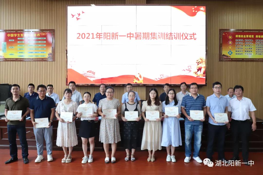 在通报表彰环节,教科室主任焦龙河通报各学科组培训分会场到位率,解读培训会指南和专刊的意义以及优秀学员的评选办法,宣读《阳新一中关于通报表彰2021年暑期培训优秀学员的通知》文件,并对优秀学员表达衷心的祝贺与殷切的希望,号召全体教师学以致用,切实将学习成果转化加持在今后教育教学的行动中去,争创新业绩。监察室戴征辉主任通报了集训期间的考勤情况。校领导为优秀学员颁奖并合影留念。