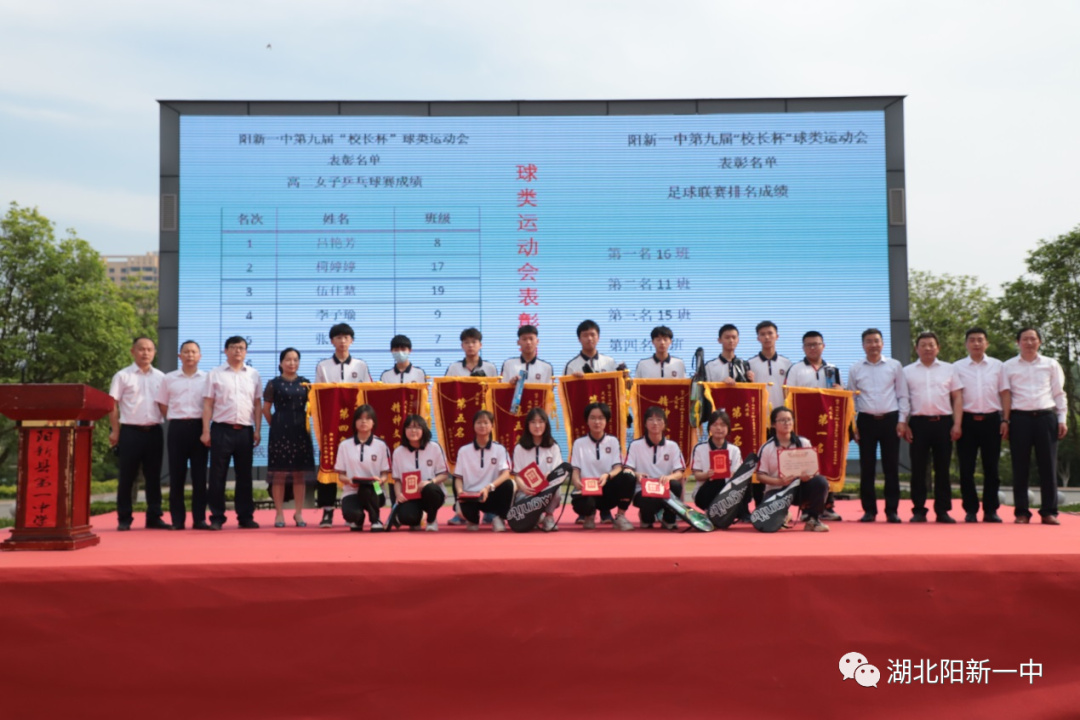 年级副主任汪洋宣读了第九届“校长杯”球类运动会表彰女子乒乓球前8名、男子足球联赛前6名以及精神文明奖、金靴奖等名单。明校长、江副校长、家委会会长等为受表彰班级和学生颁发锦旗、证书及奖品。