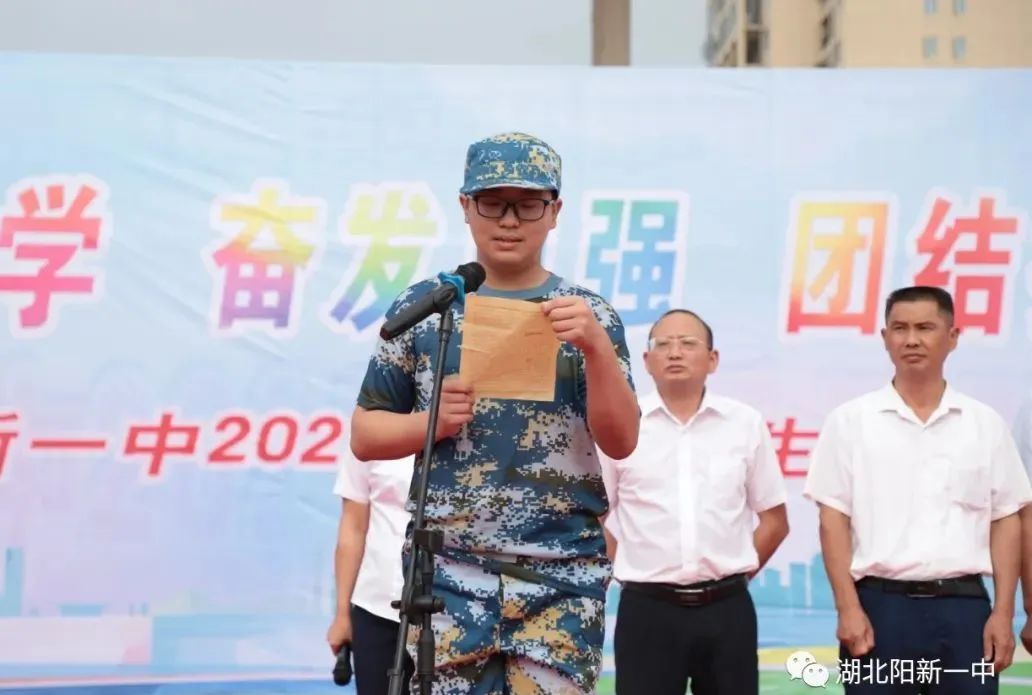 高一新生代表乐怡默分享了他进一中以来的见闻感悟,畅叙军训憧憬,决心在此次国防教育中,团结协作,迎难而上,激扬青青,勇争第一。