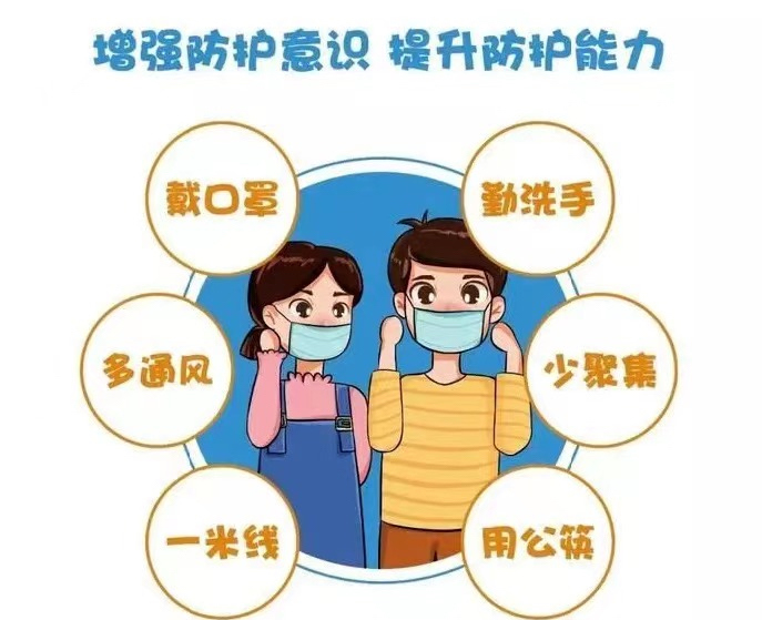 戴口罩、勤洗手、不聚集。学生在上下学时,做好个人防护。如无必要,尽量不参加各类聚集性活动,在出入公共场所、乘坐公共交通工具、到医疗机构就医时,均要全程佩戴口罩,勤洗手、多消毒、常通风。密切关注自己及周围人的健康状况,一旦有异常,要第一时间主动报告,并按要求落实健康管理措施。