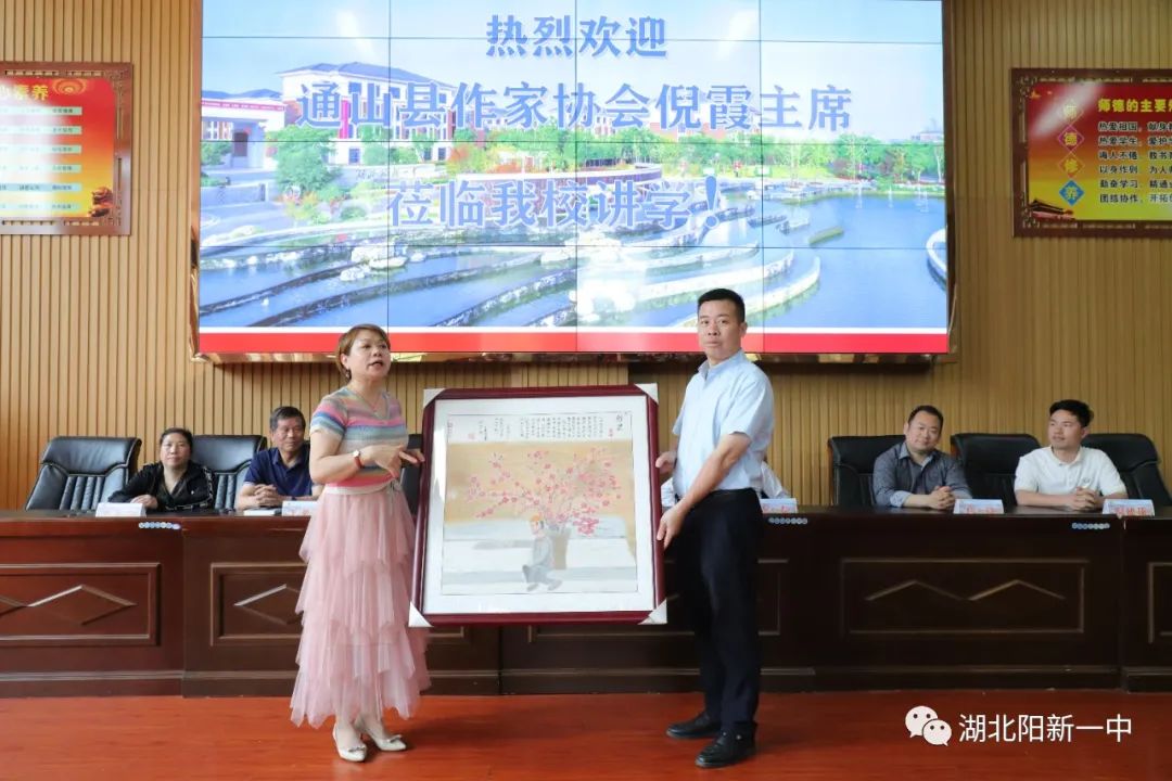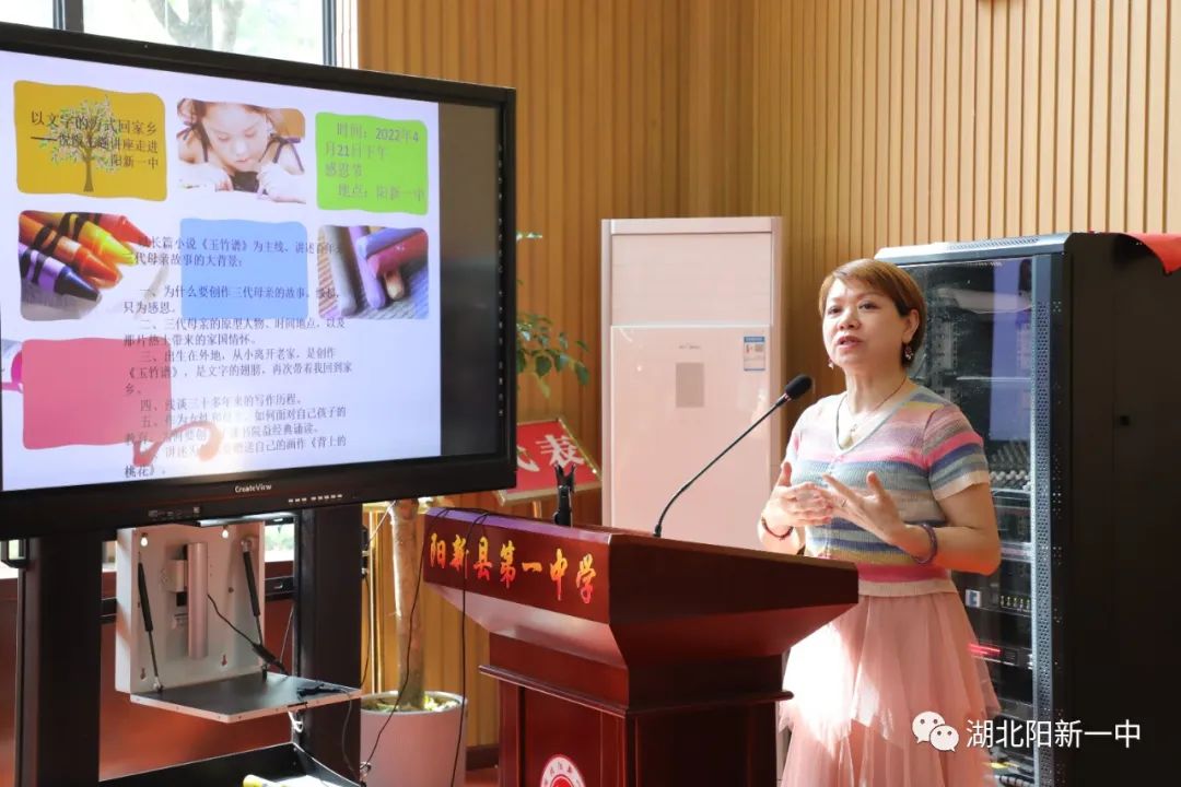 21日下午,咸宁市作协副主席、通山县作协主席、中国作协会员、知名作家倪霞应邀前来我校,在明德楼道德讲堂作《以文字的方式回家乡》的主题文学讲座。咸宁市作协主席李专及夫人,阳县新文联主席彭书桃,通山县作协会员焦锋、倪健雄、华兰芳,阳新县中国银行中层干部倪胜林,阳新县四级调研员王义浩出席活动。阳新一中高一年级300余名学生聆听讲座。讲座由阳新一中教师、阳新作协秘书长曹祥才主持。